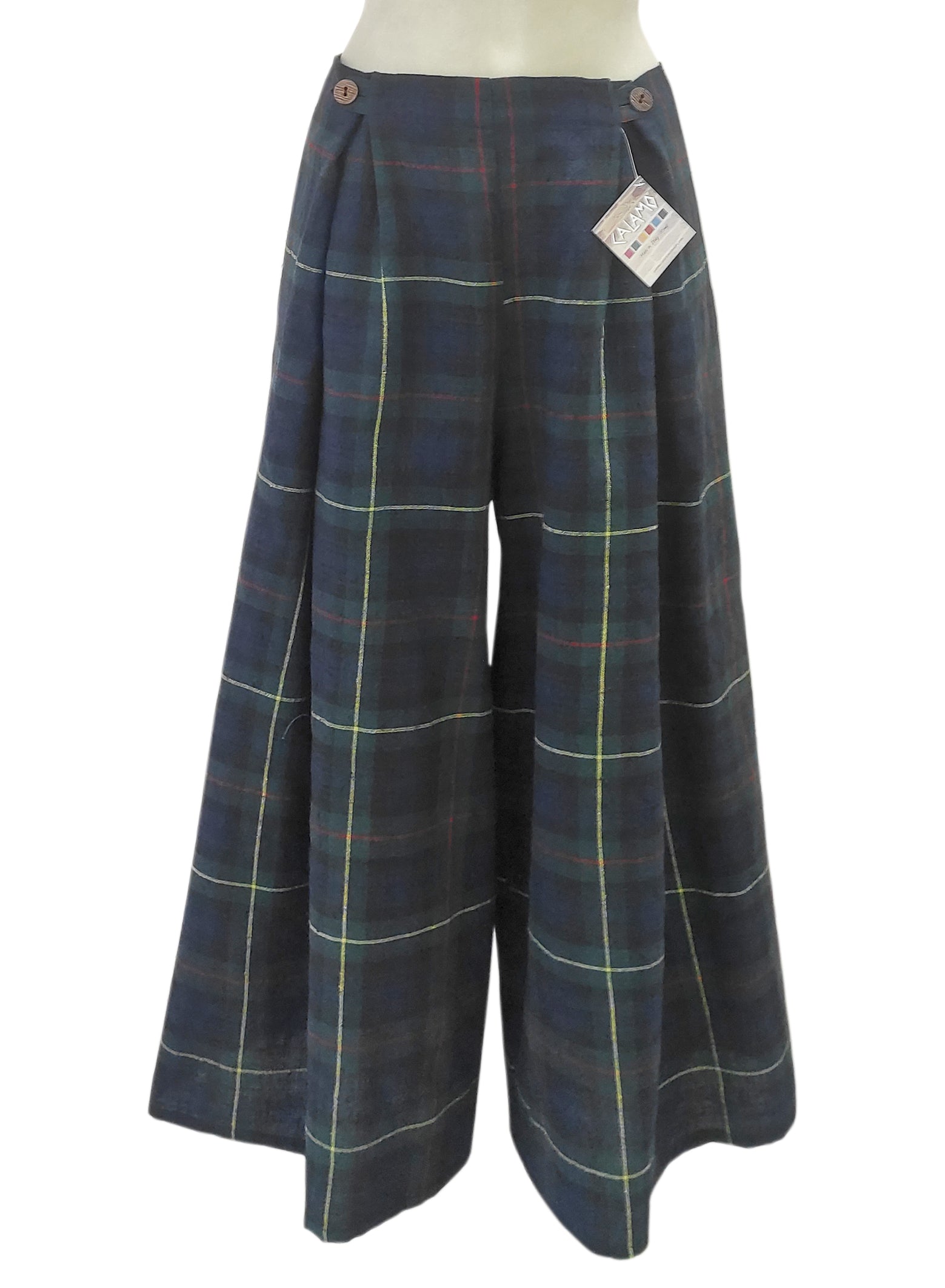 Pantalone morbido a palazzo, realizzato in cotone (100%). Consente un’ampia vestibilità in quanto la misura della vita è regolabile: i bottoni possono essere spostati e regolati sul proprio punto vita.