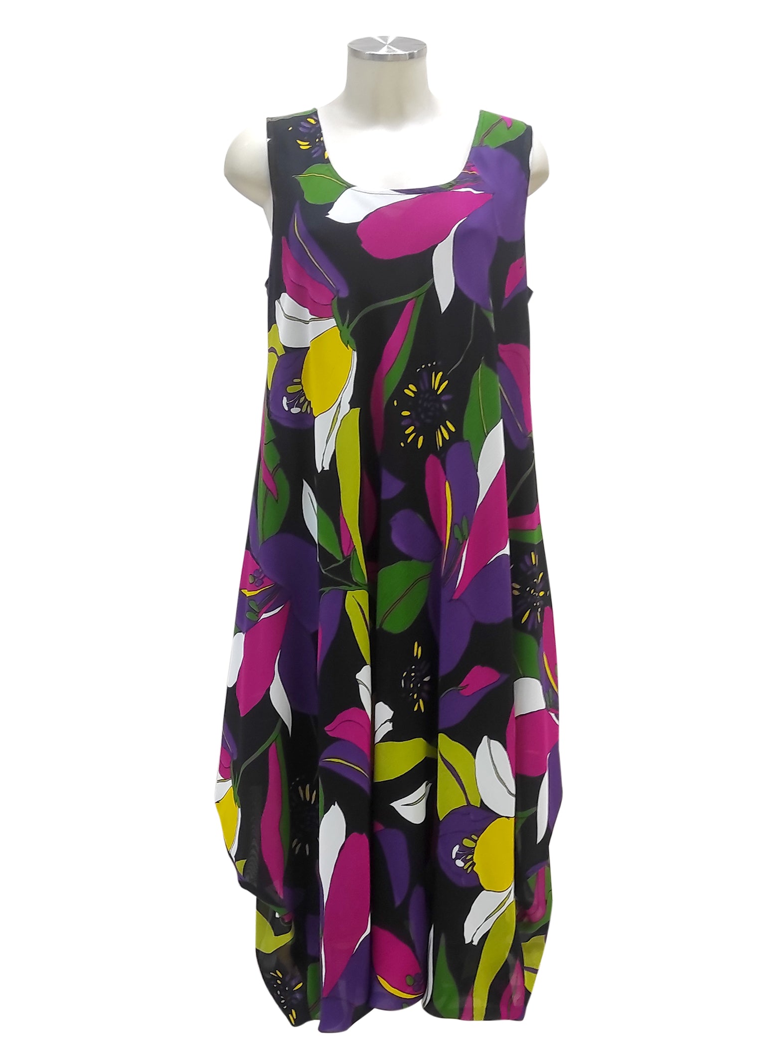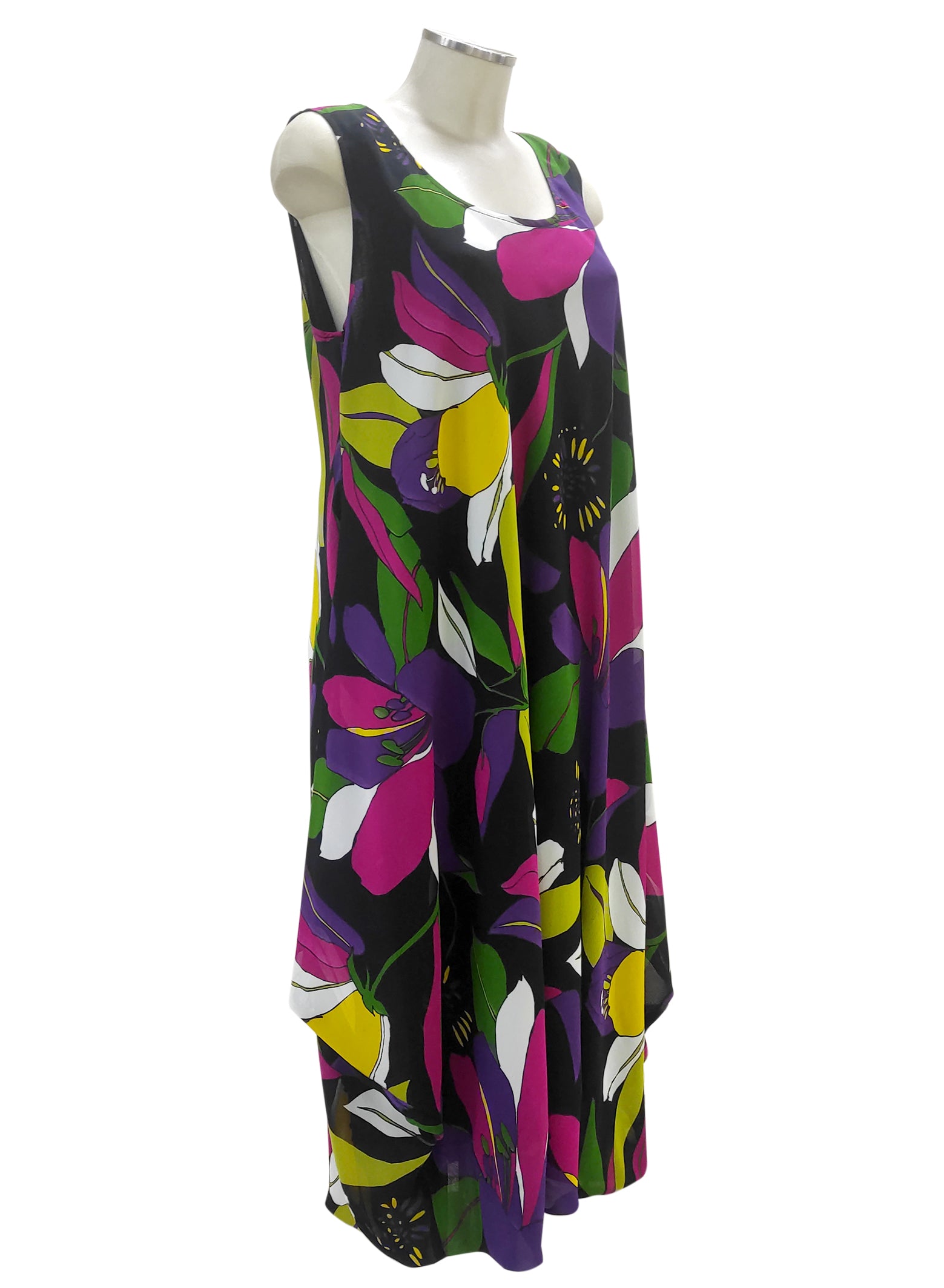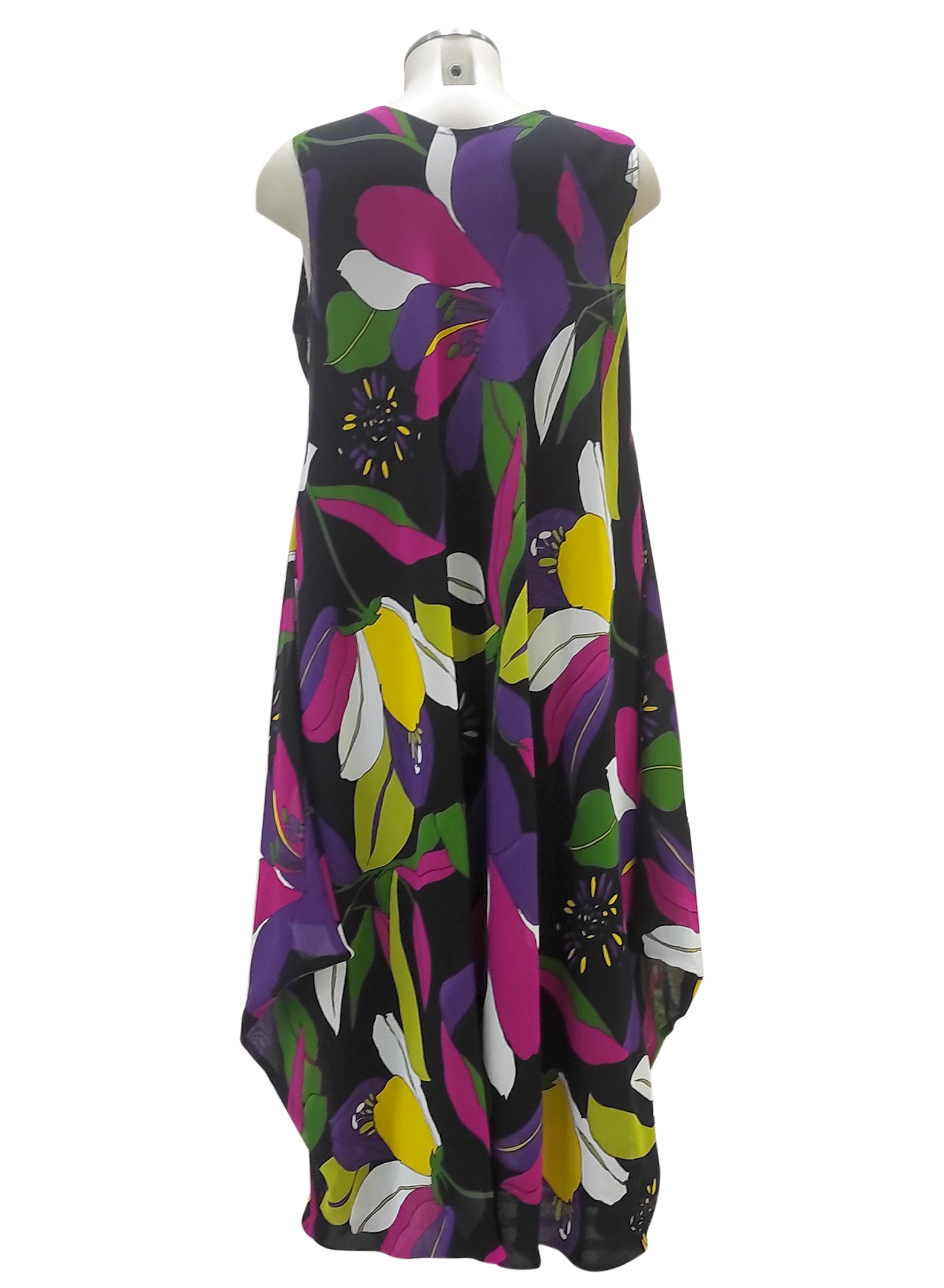 Abito smanicato dal taglio sbieco, realizzato in georgette, 100% viscosa. Per completare il look, l’abito Luna può essere abbinato insieme allo spolverino Antonella viola.