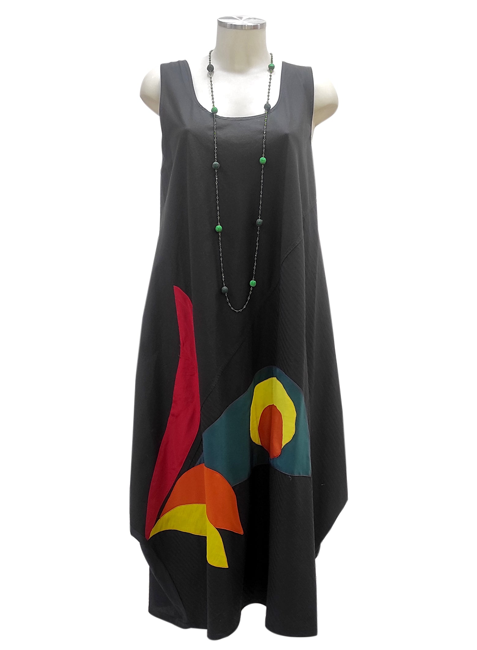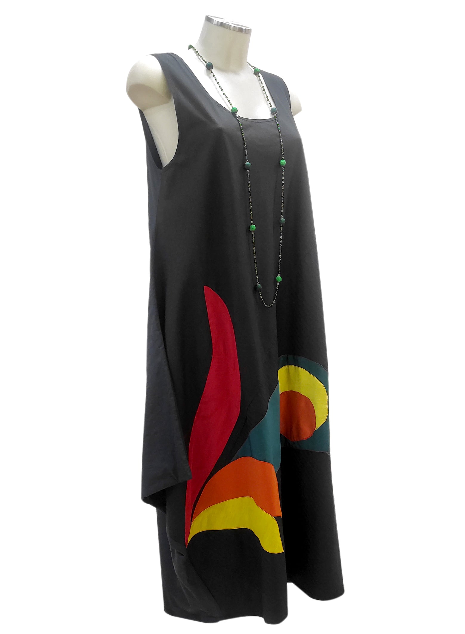Abito casual, e comodo grazie al taglio in sbieco. Realizzato in fresco cotone. L’abito presenta particolari inserti colorati applicati lateralmente. Per completare il look, l’abito può essere abbinato ad una delle nostre collane in vetro o seta colorate.
