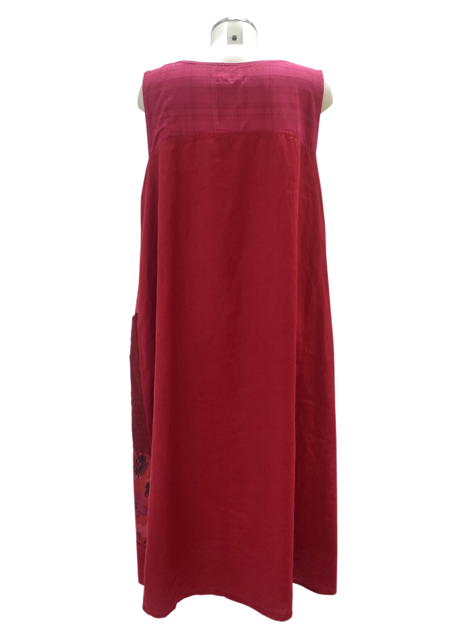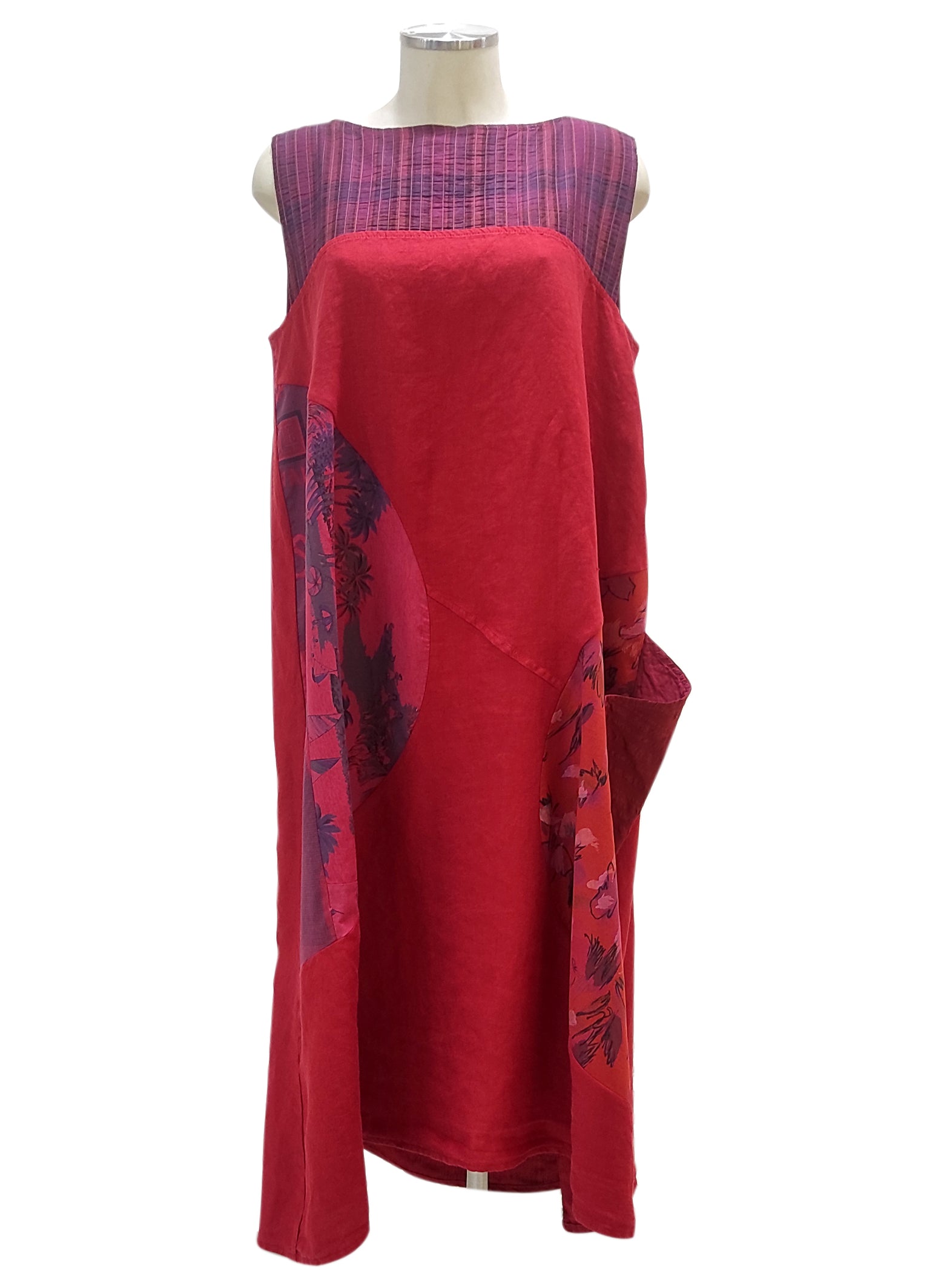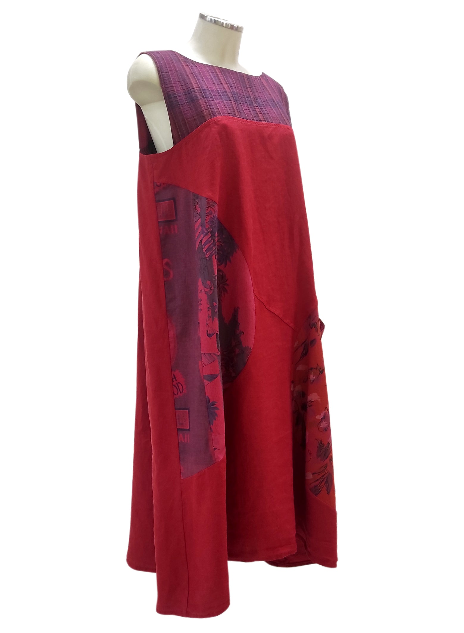 Abito dal taglio dritto realizzato in fresco lino. L’abito ha una scollatura quadrata, ed è stato decorato con varie stampe tono su tono, sui lati dell’abito, il retro è in tinta unita.