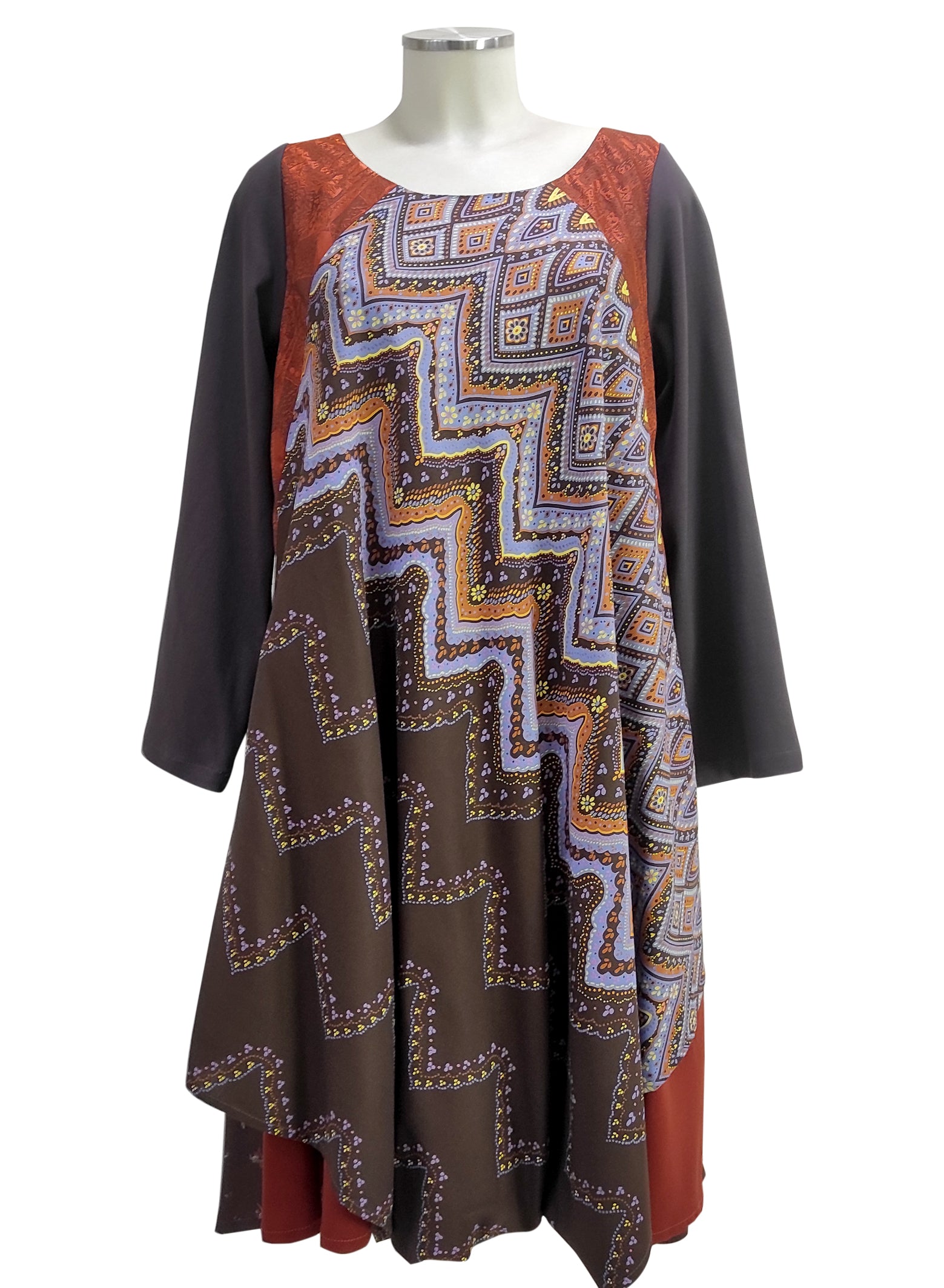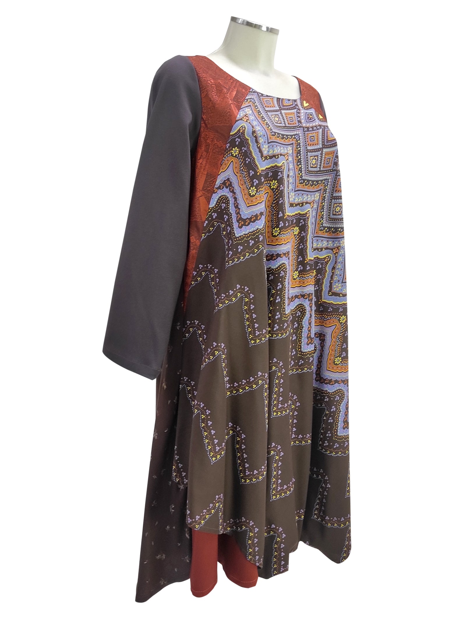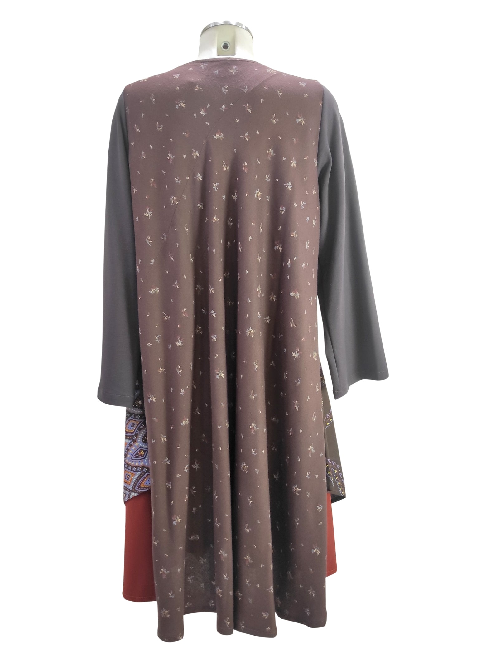Abito casual, dal taglio dritto. La particolarità dell’abito sta nella scelta dei vari tessuti di colore e fantasie diverse utilizzati. L’abito è realizzato in cady di viscosa. Per completare il look si può abbinare una delle nostre collane in fili di seta e vetro.