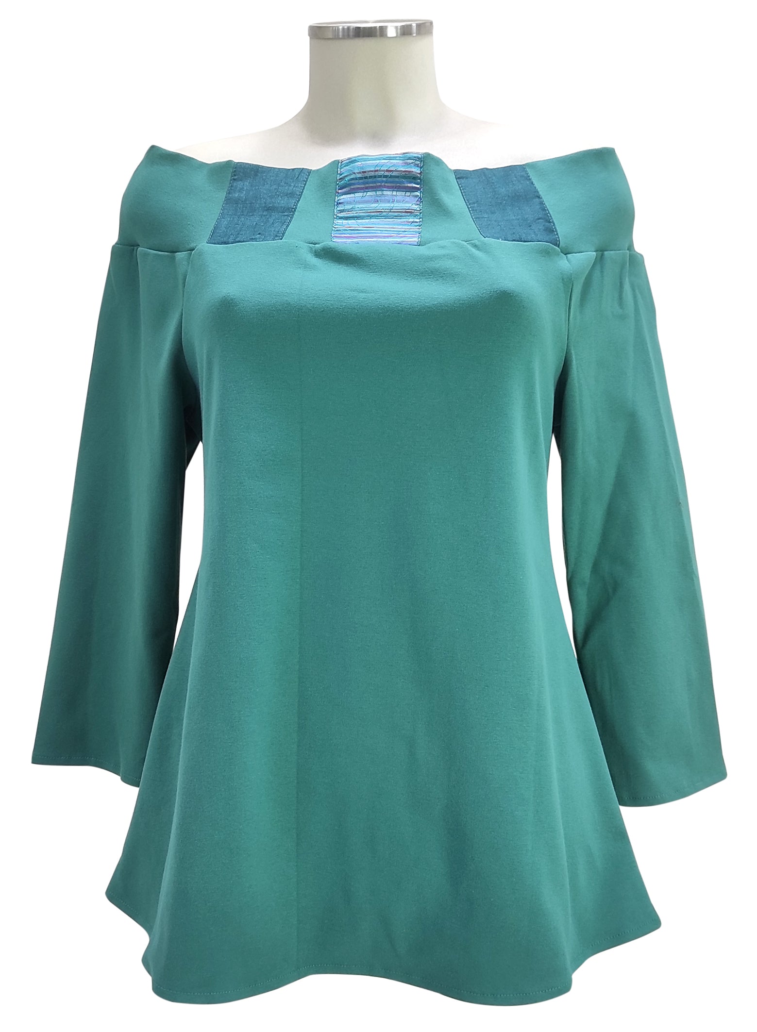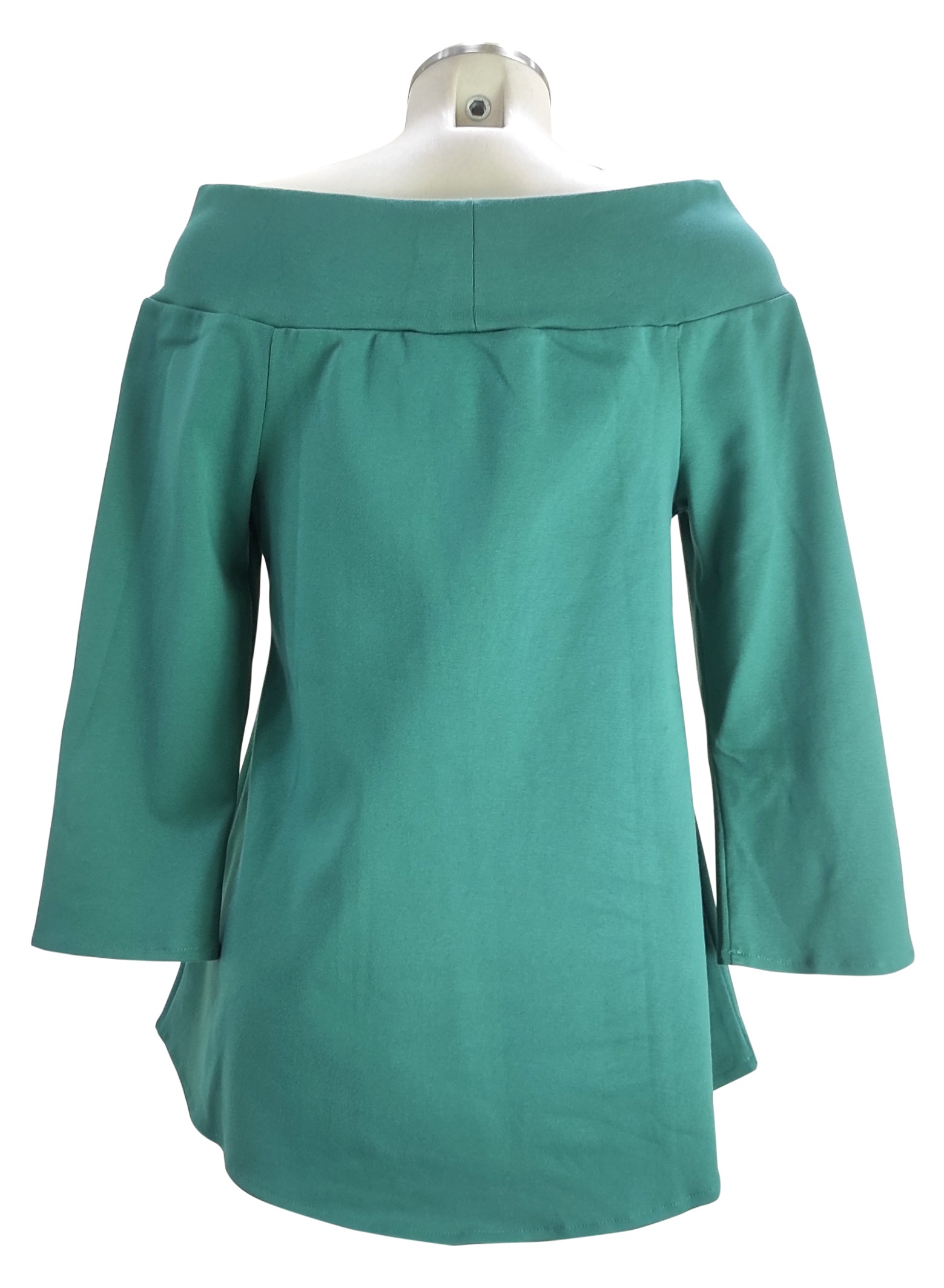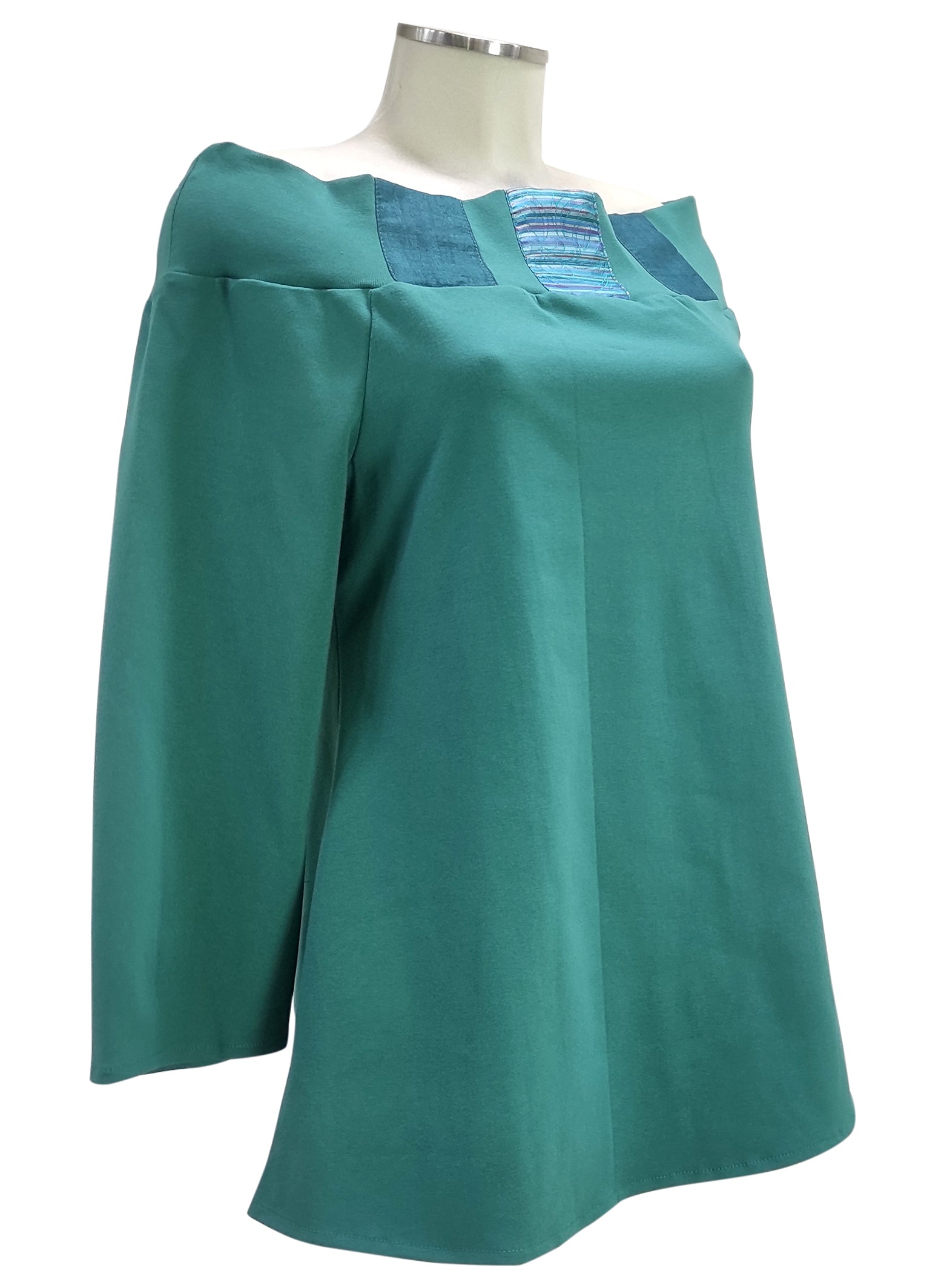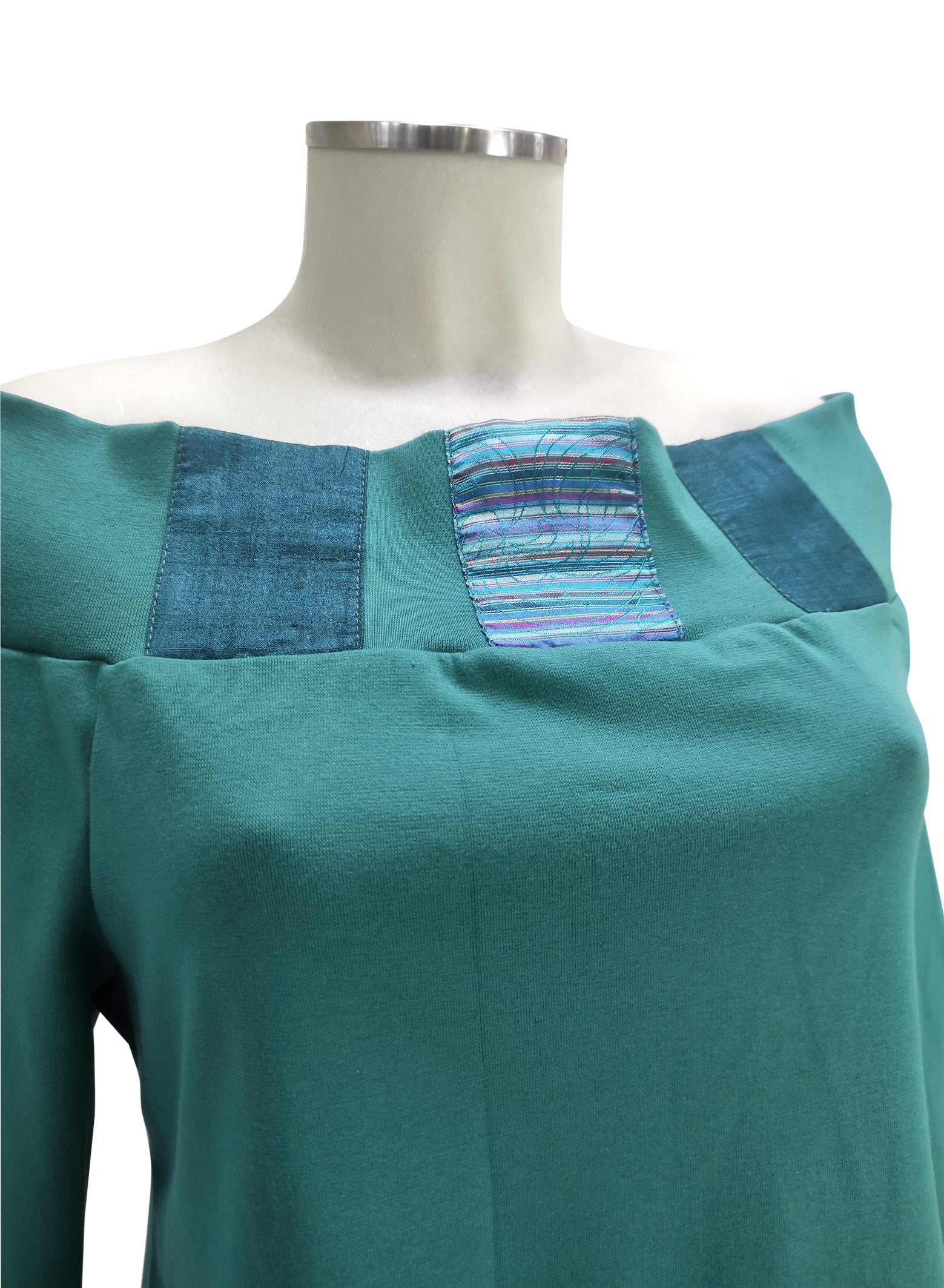 La maglia Ohara ha uno scollo a barca e può essere indossata anche scesa sulle spalle. La maglia è stata realizzata con un tessuto morbido ed elasticizzato. Rendono particolare la maglia le applicazioni di varie sfumature applicate sul collo.