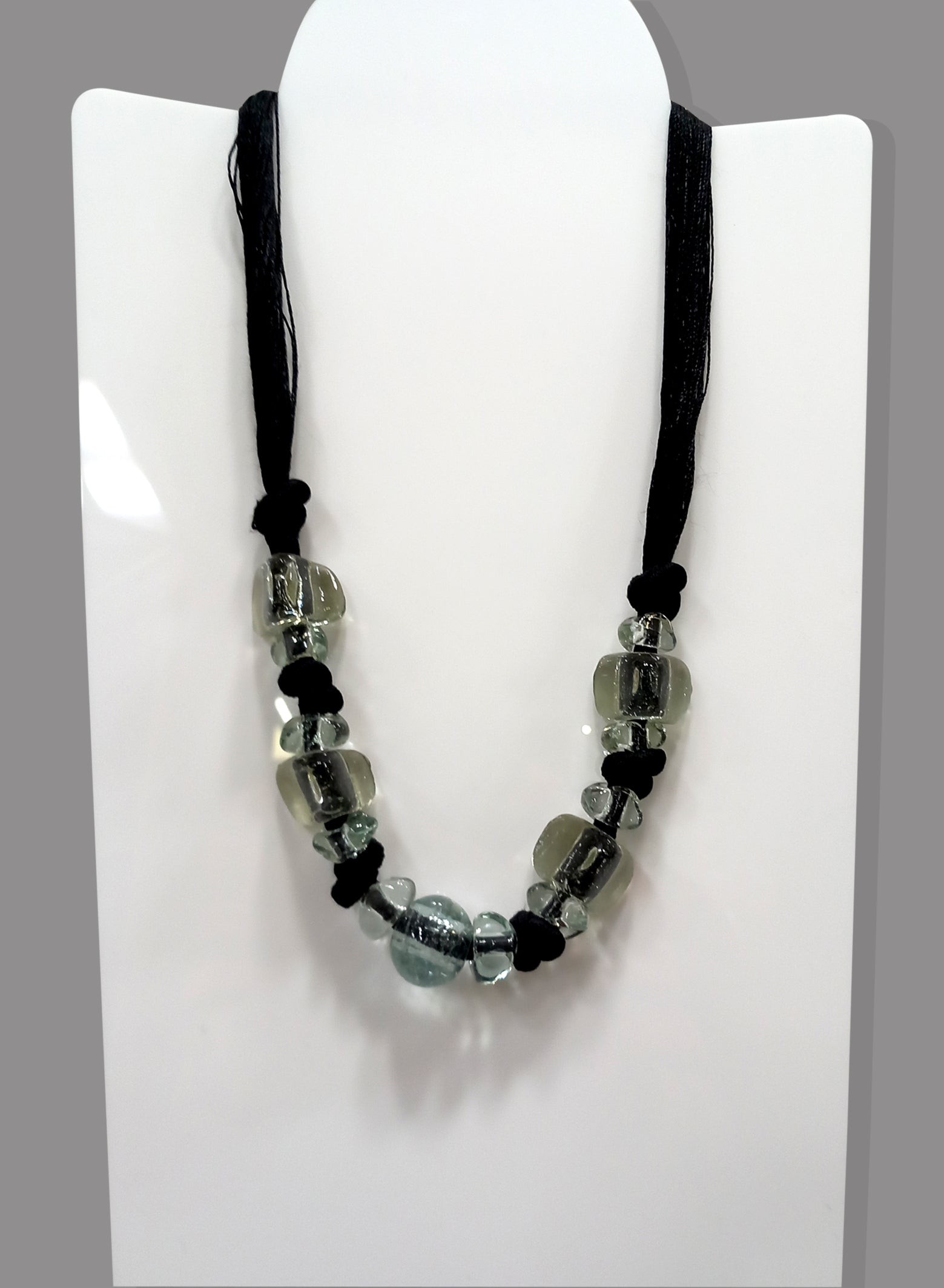 Elegante collana in fili di seta e perle in vetro di forme differenti.