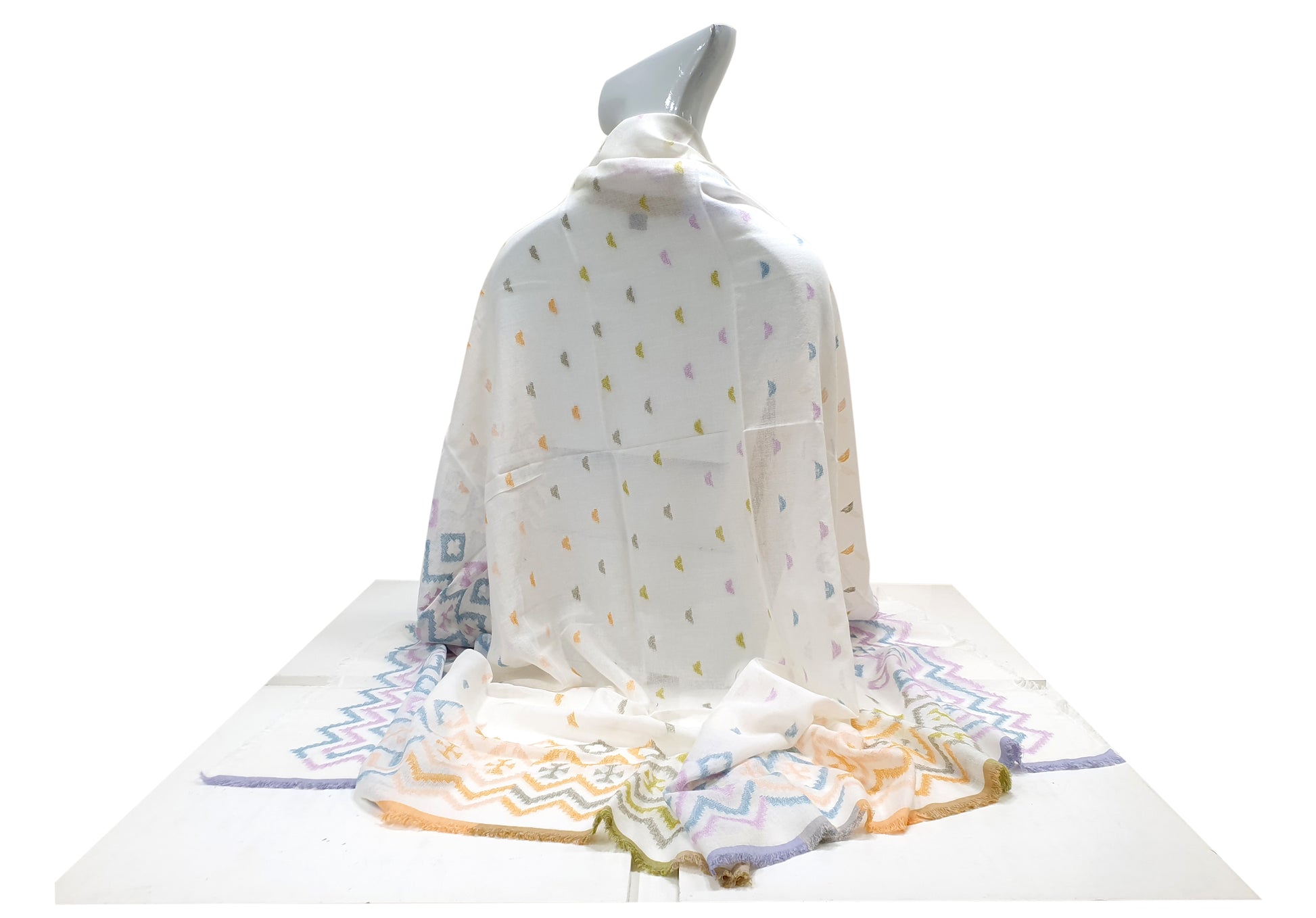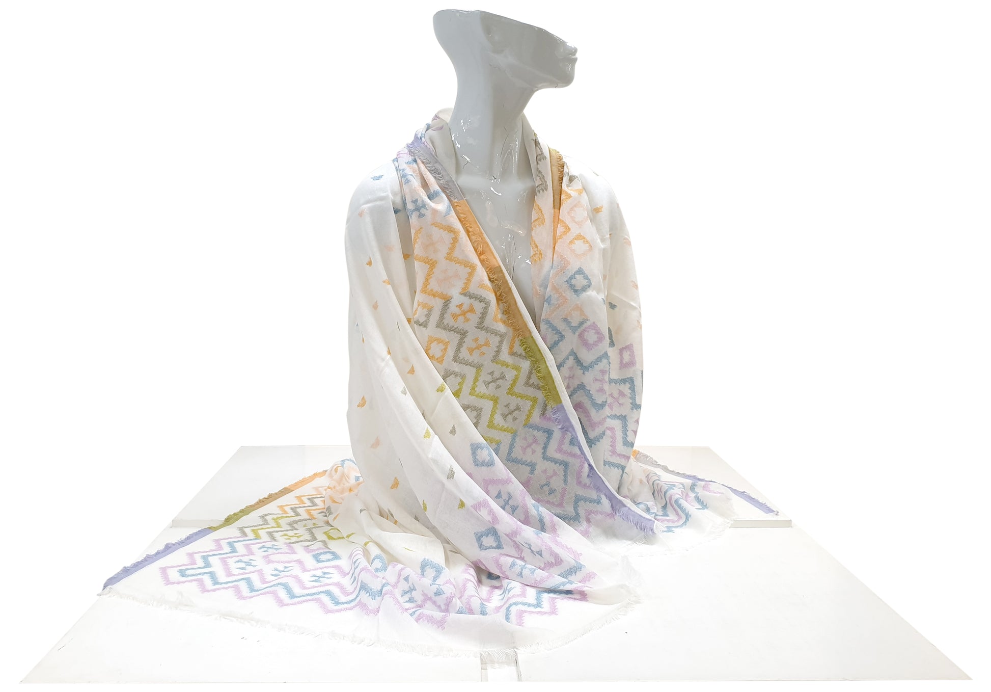 Formato quadrato, presenta dei disegni zig-zag con tonalità pesca. Composizione 100% cotone.