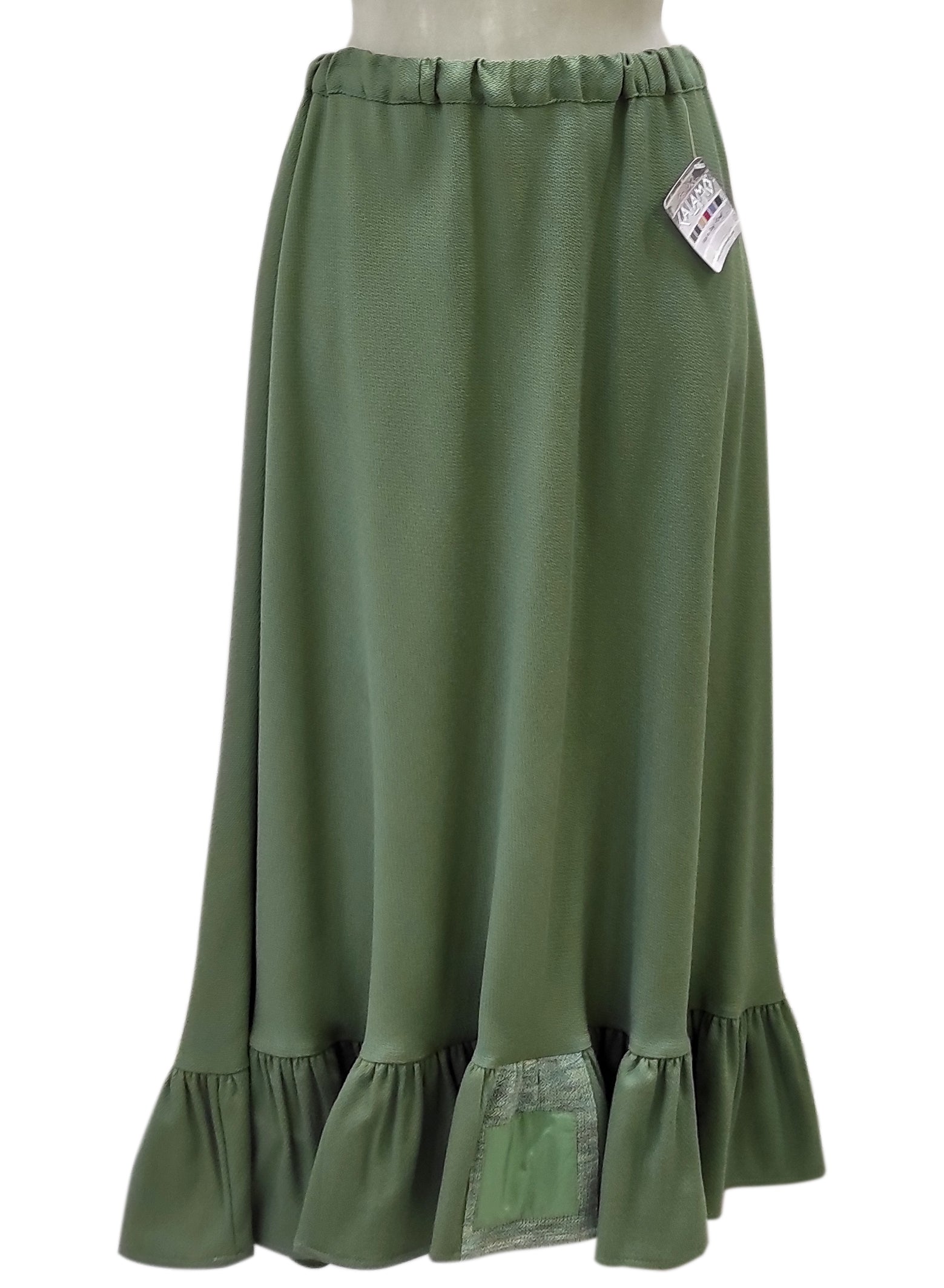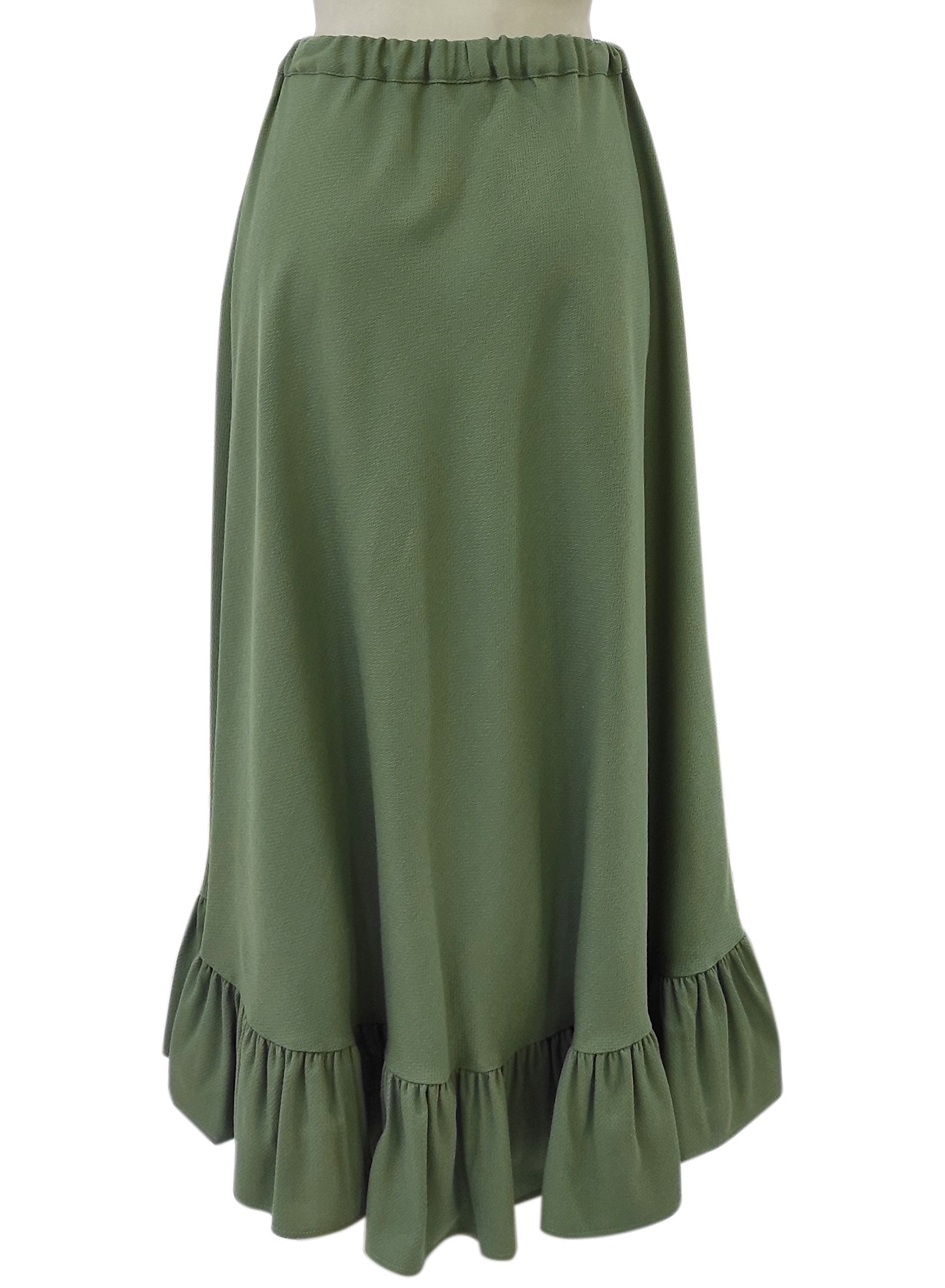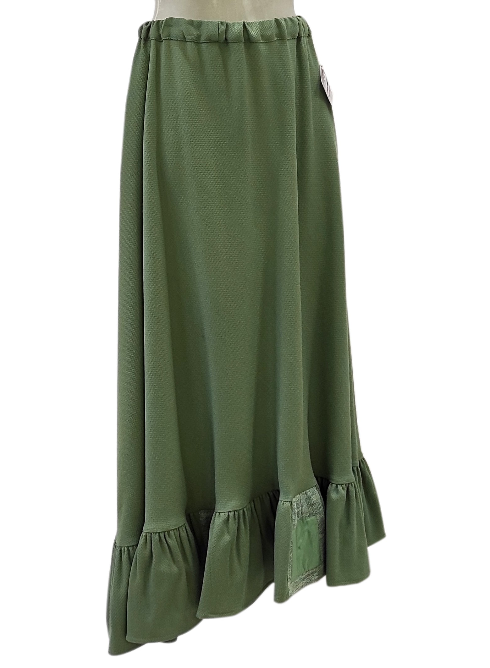 Gonna dalla linea dritta, realizzata in 70% lana. La gonna ha delle balze sul finale, decorate con delle stoffe tono su tono. In negozio disponibile in altri colori.