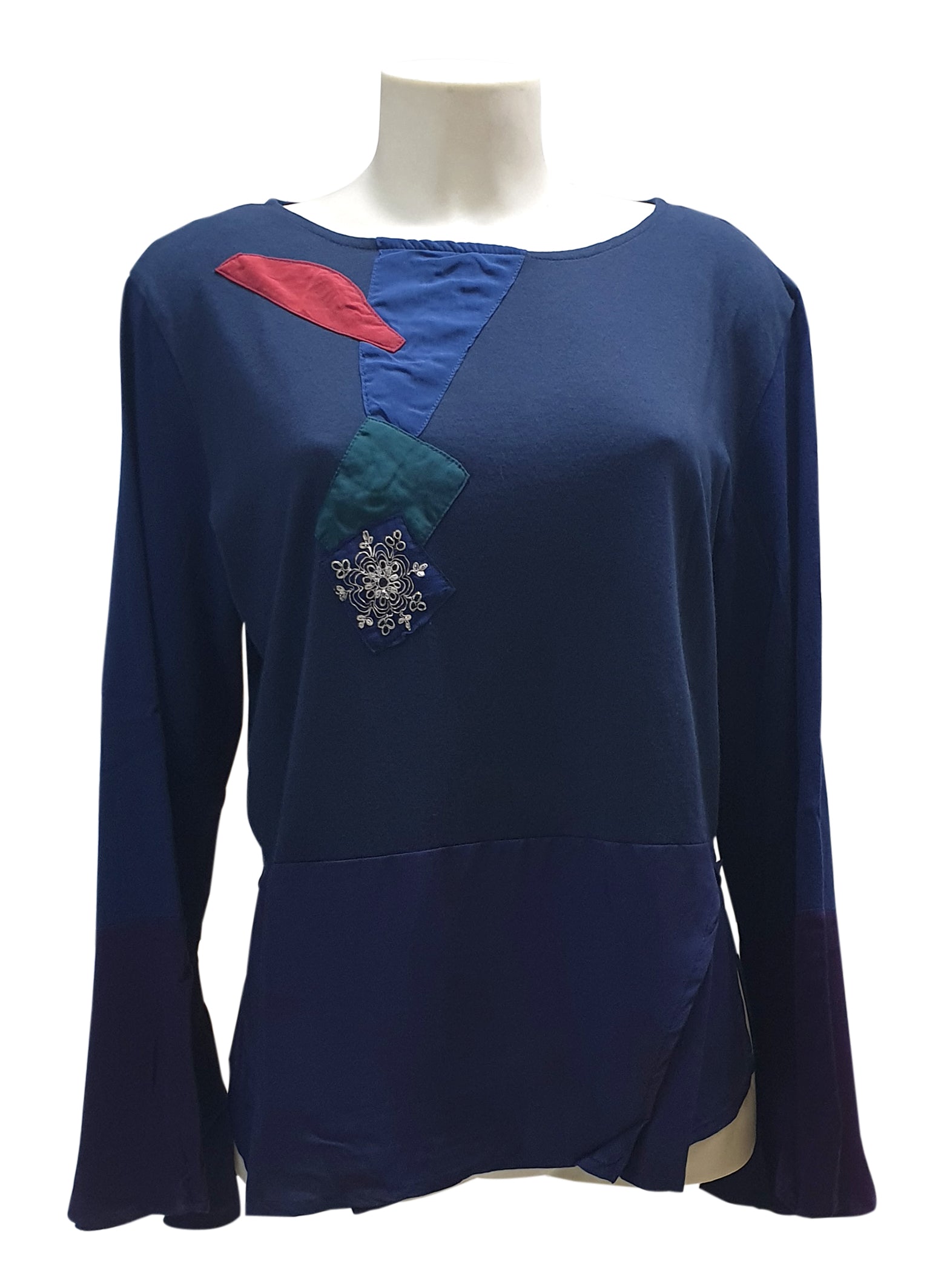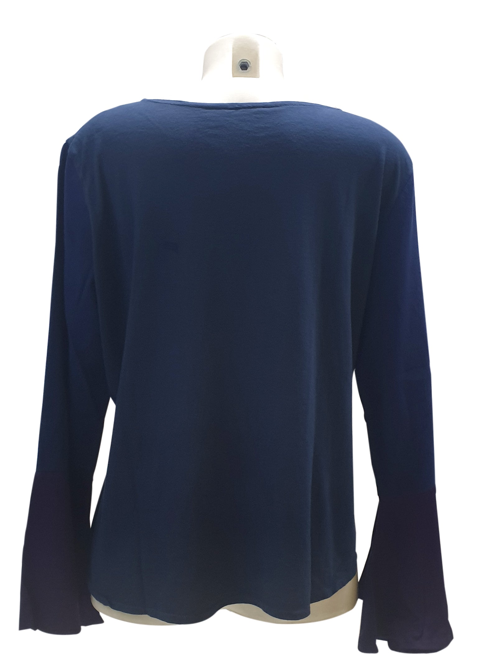 Maglia dallo stile casual, è realizzata con inserti* in tessuto, sul davanti della maglia, in cotone tono su tono. L’orlo della maglia e delle maniche ha un taglio semi-ruota è in viscosa.