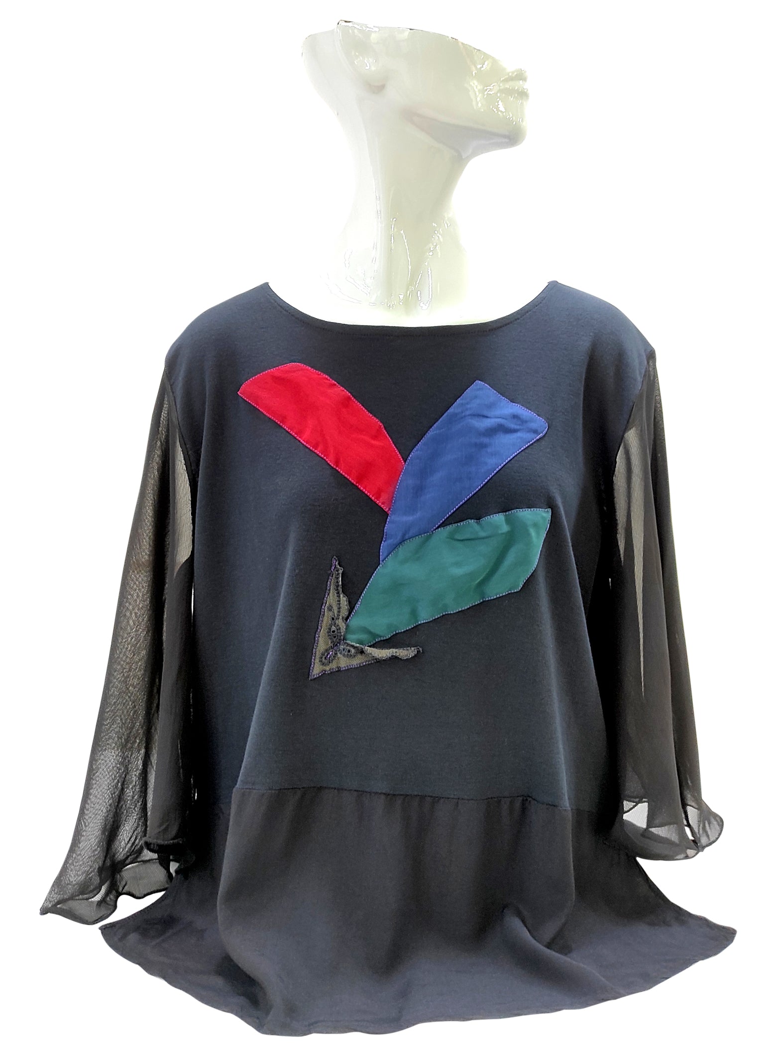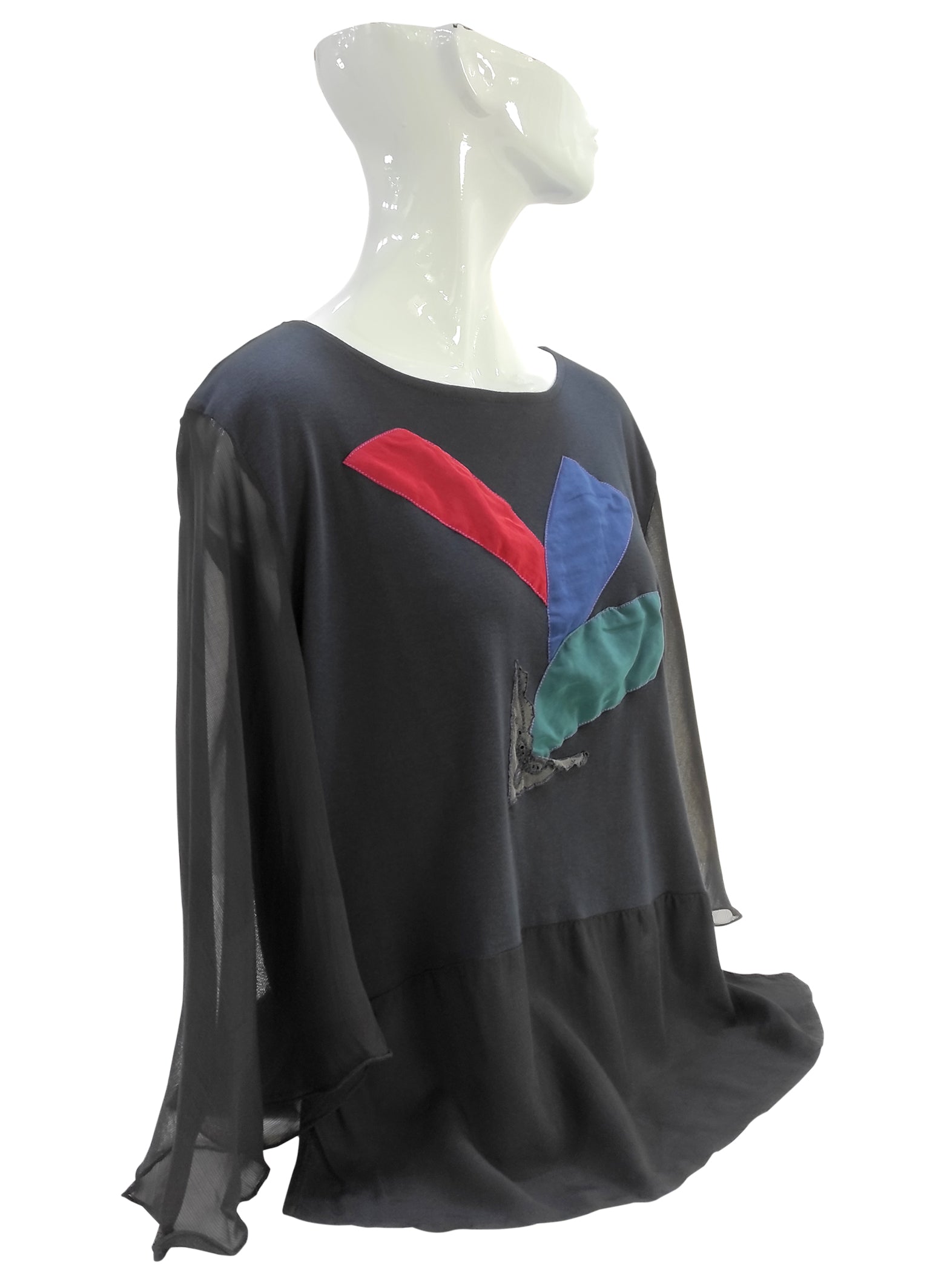 Maglia dallo stile casual in cotone, decorata con inserti in tessuto colorati stile patchwork. L’orlo e le maniche della maglia sono in viscosa con un taglio semi ruota.
