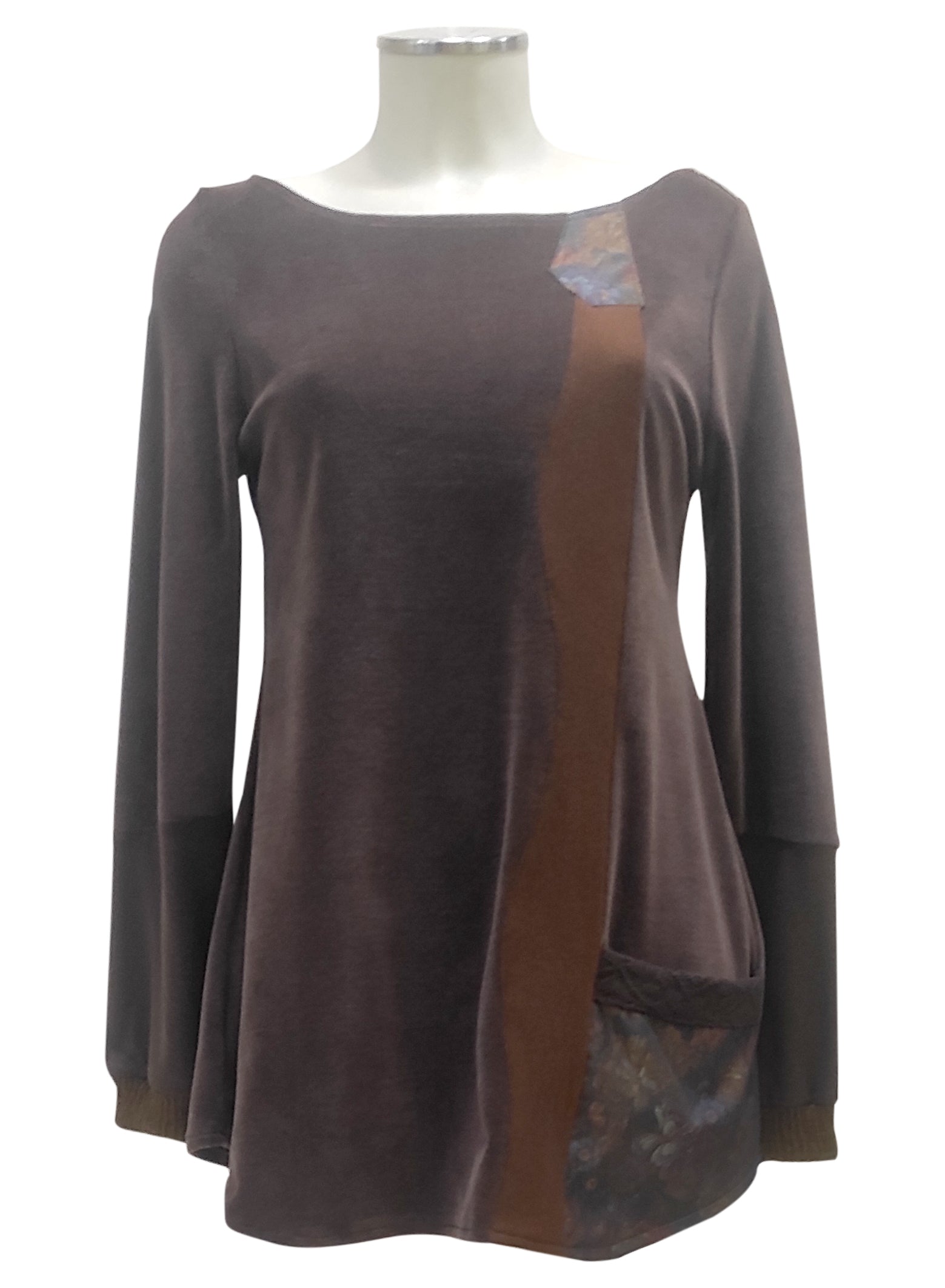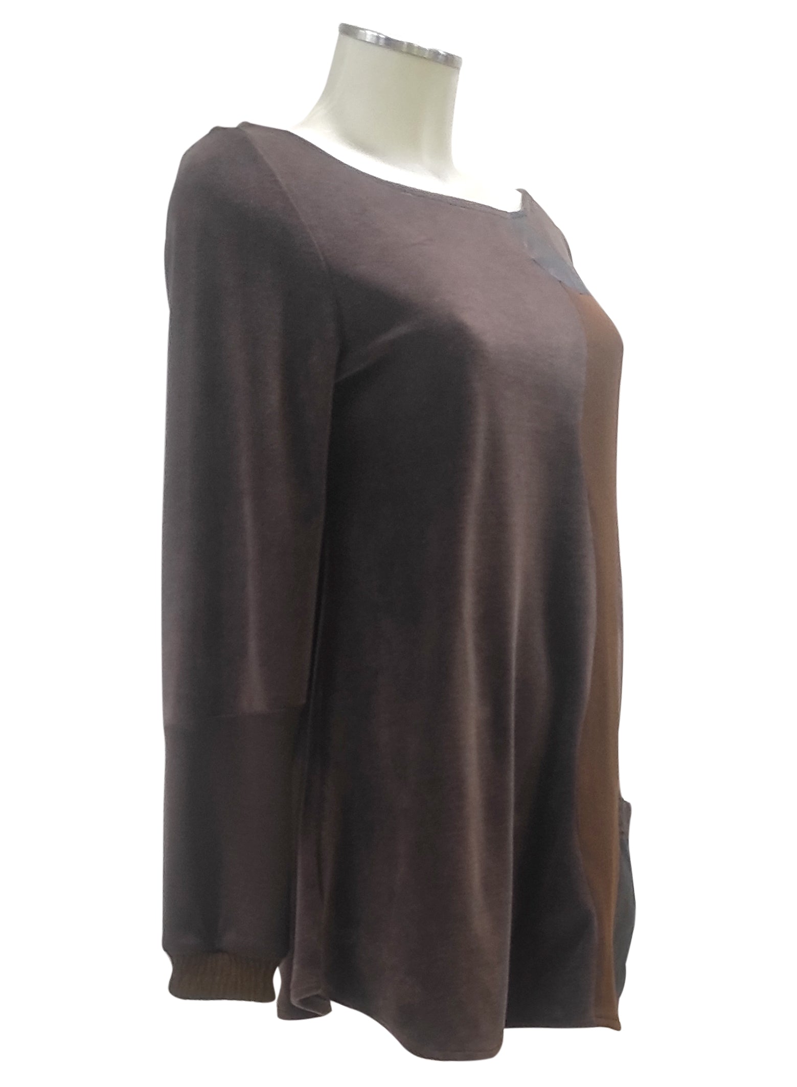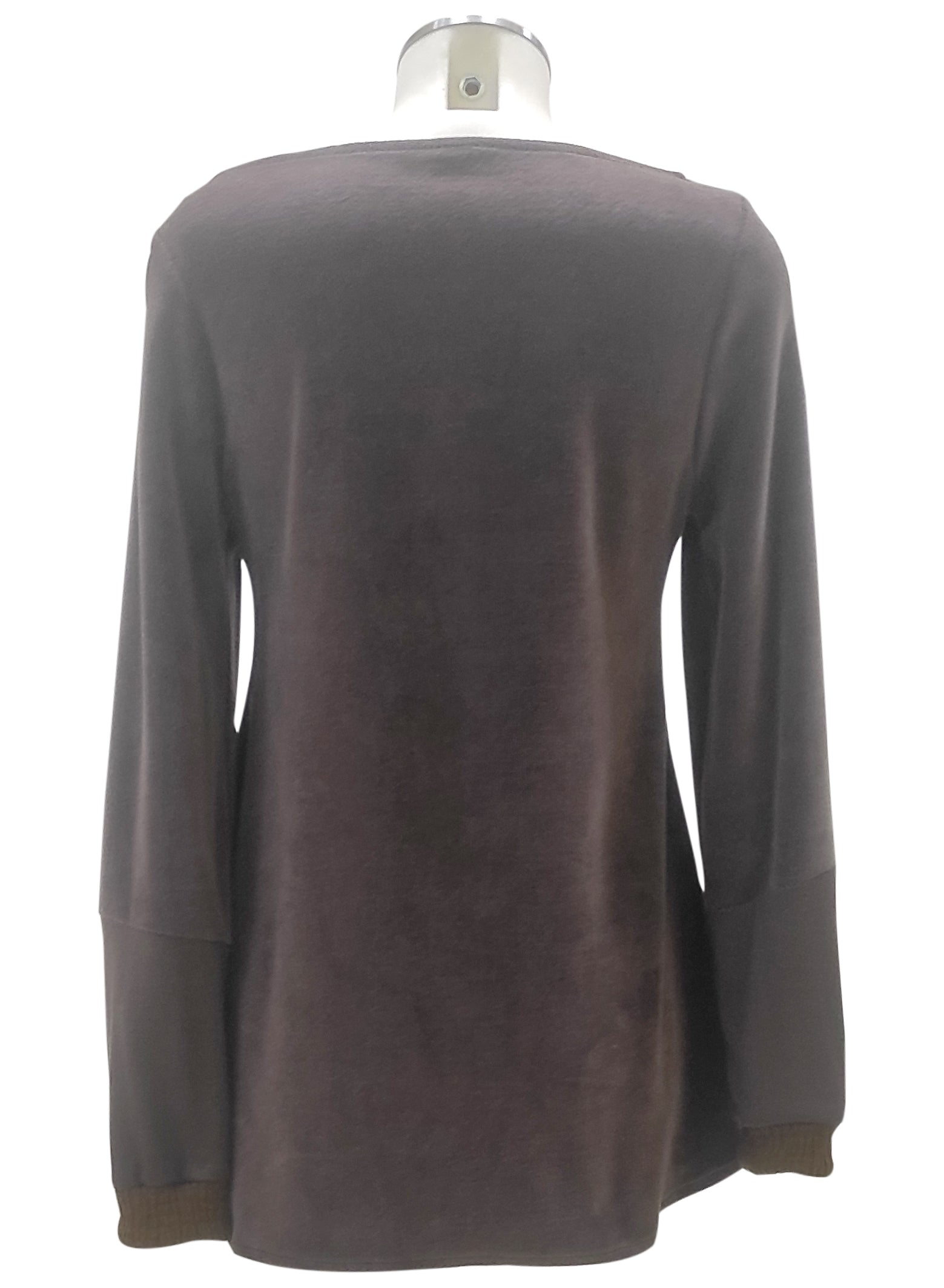 Maglia dallo stile avvitato, realizzata in morbida ciniglia marrone, e decorata con inserti di stoffe con toni più scuri. La Maglia ha uno scollo a barca, e può essere abbinata al Leggins in Ciniglia Marrone, per un look versatile e comodo.