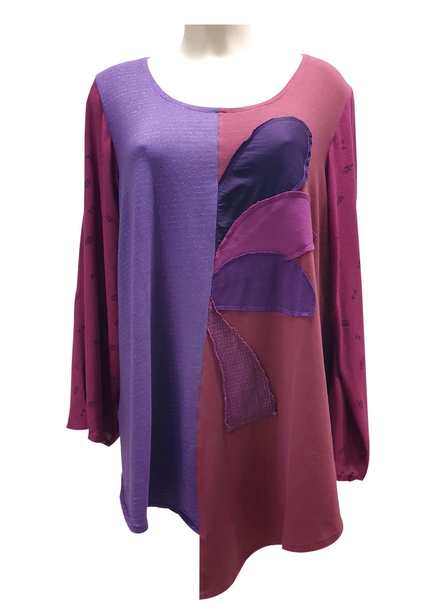 Maglia dallo stile casual, realizzata in cotone con motivi e inserti patchwork*, su stessa scala di colore. È asimmetrica sul davanti e ha delle ampie maniche a ¾.