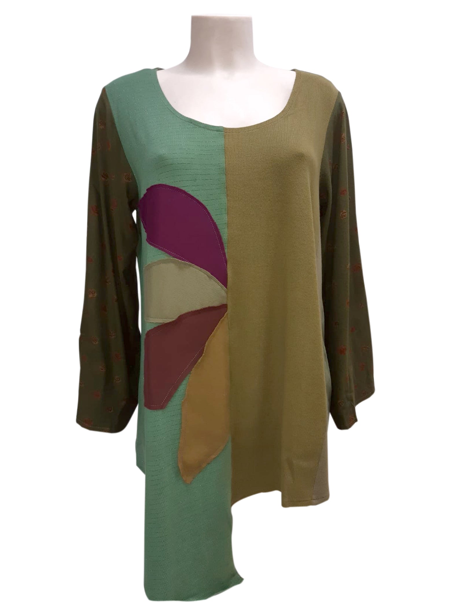 Maglia dallo stile casual, realizzata in cotone con motivi e inserti patchwork*, su stessa scala di colore. È asimmetrica sul davanti e ha delle ampie maniche a ¾.