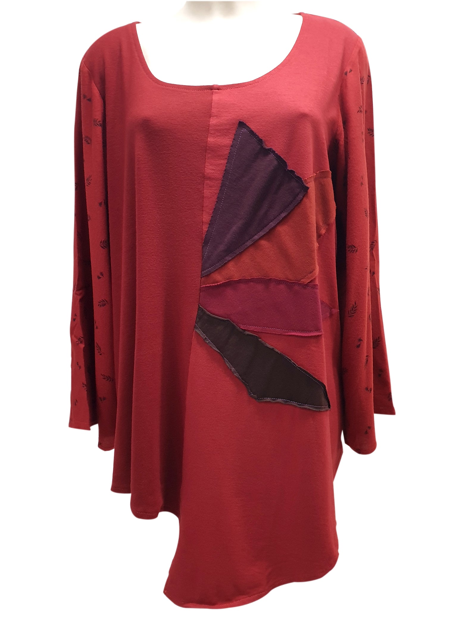 Maglia dallo stile casual, realizzata in cotone con motivi e inserti patchwork*, su stessa scala di colore. È asimmetrica sul davanti e ha delle ampie maniche a ¾.