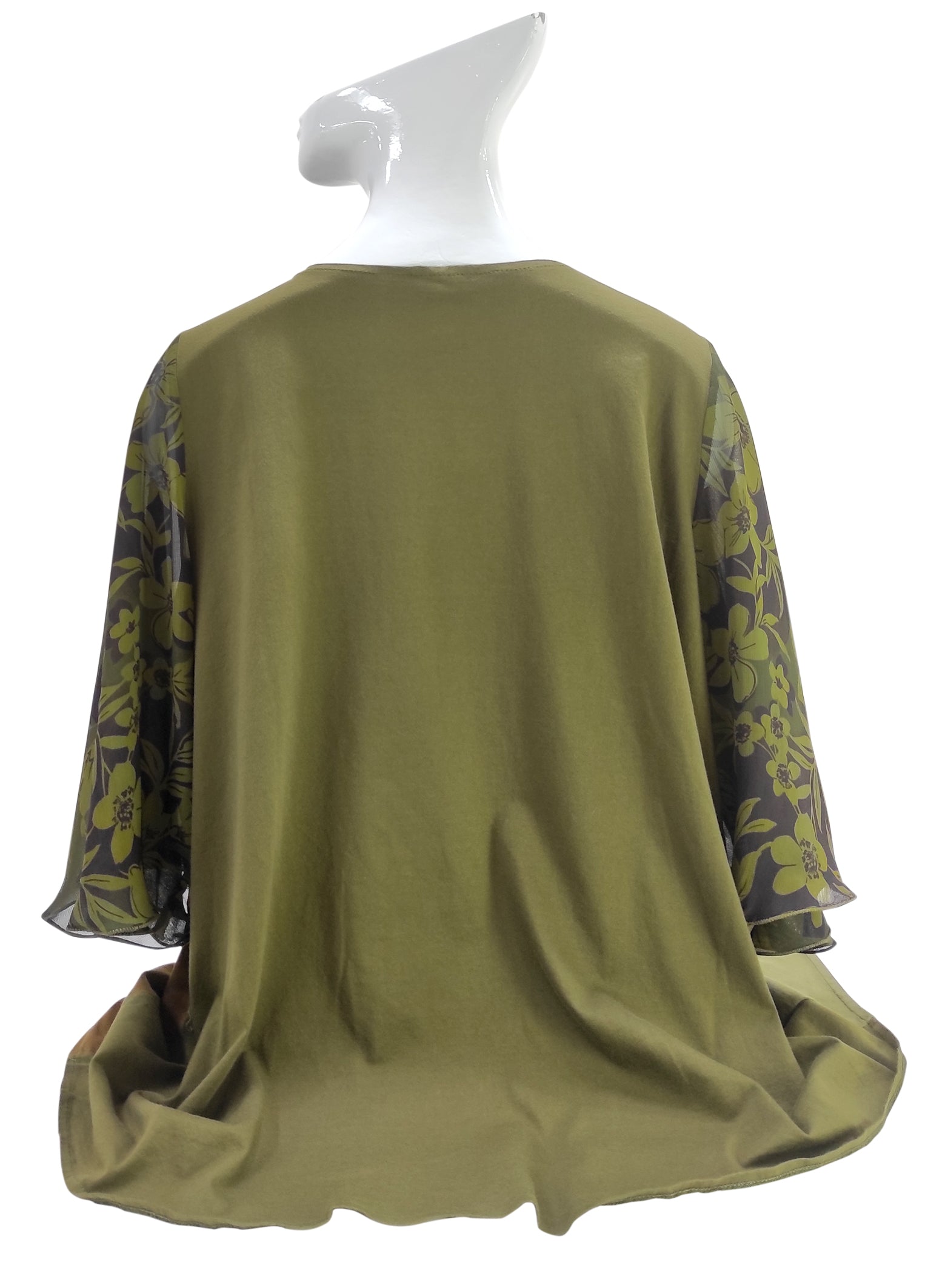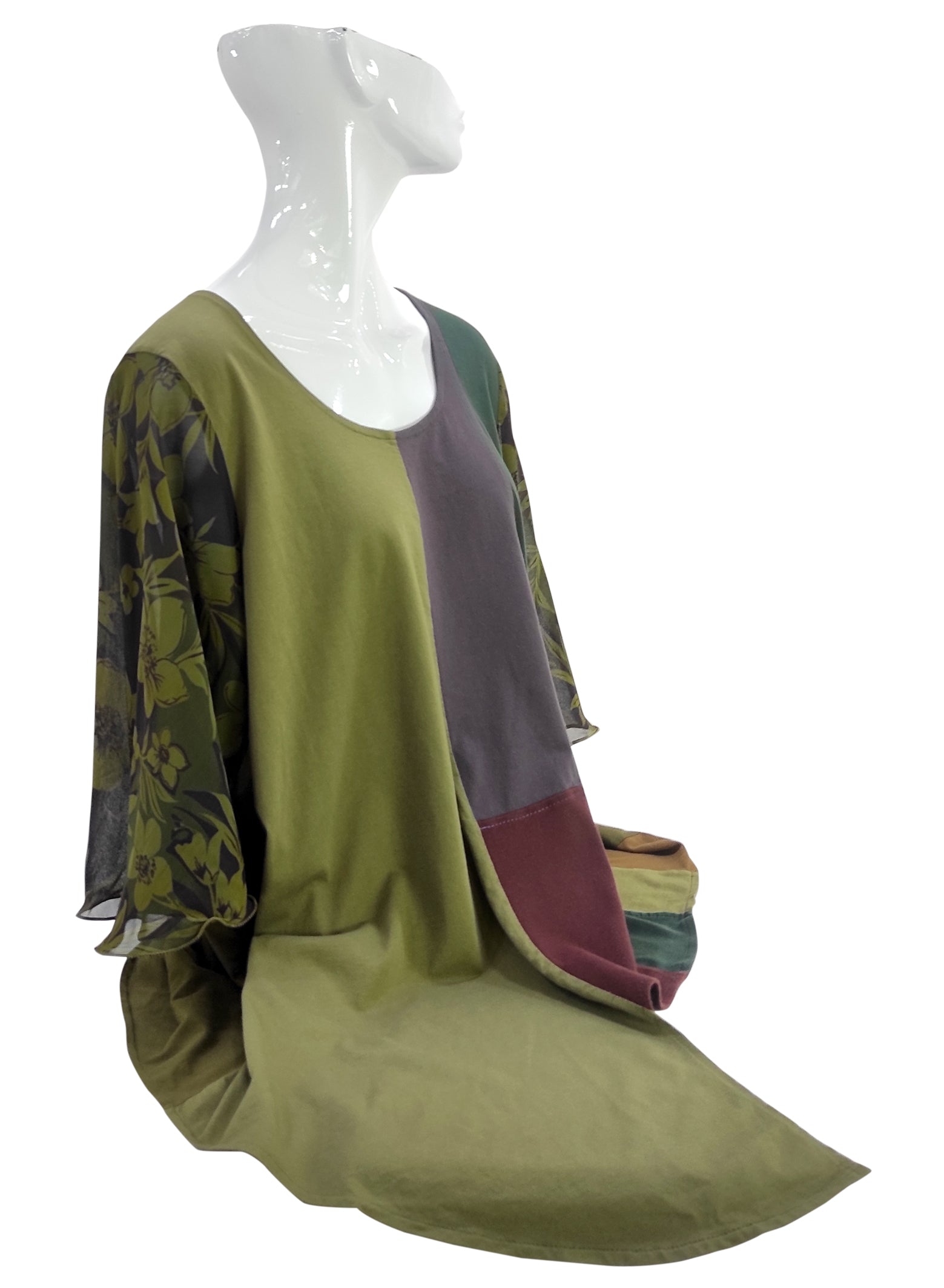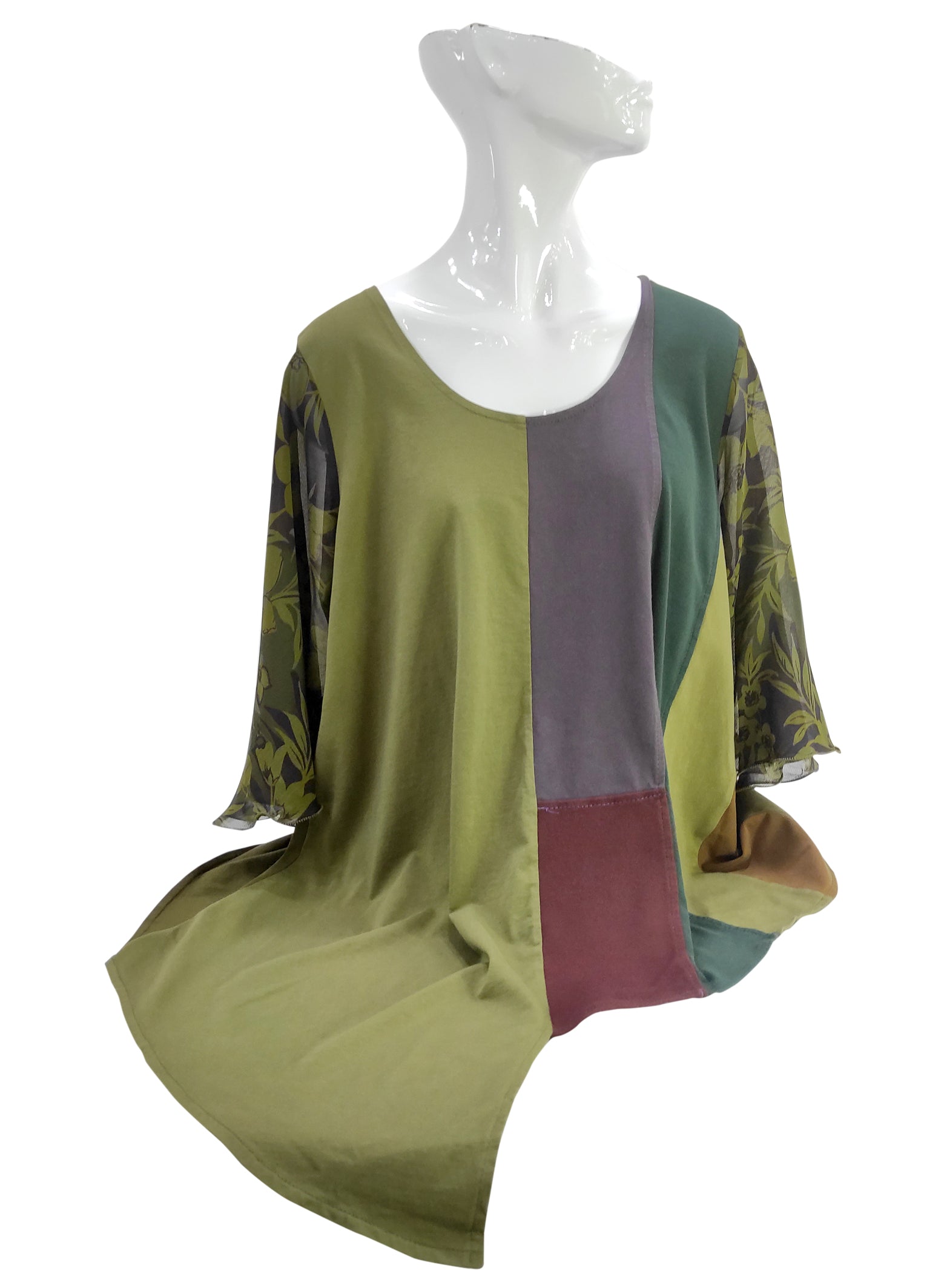 Maglia dallo stile casual, realizzata in cotone, decorata con inserti colorati in tessuto di vari colori. La maglia è asimmetrica sul davanti, e ha delle ampie maniche corte.