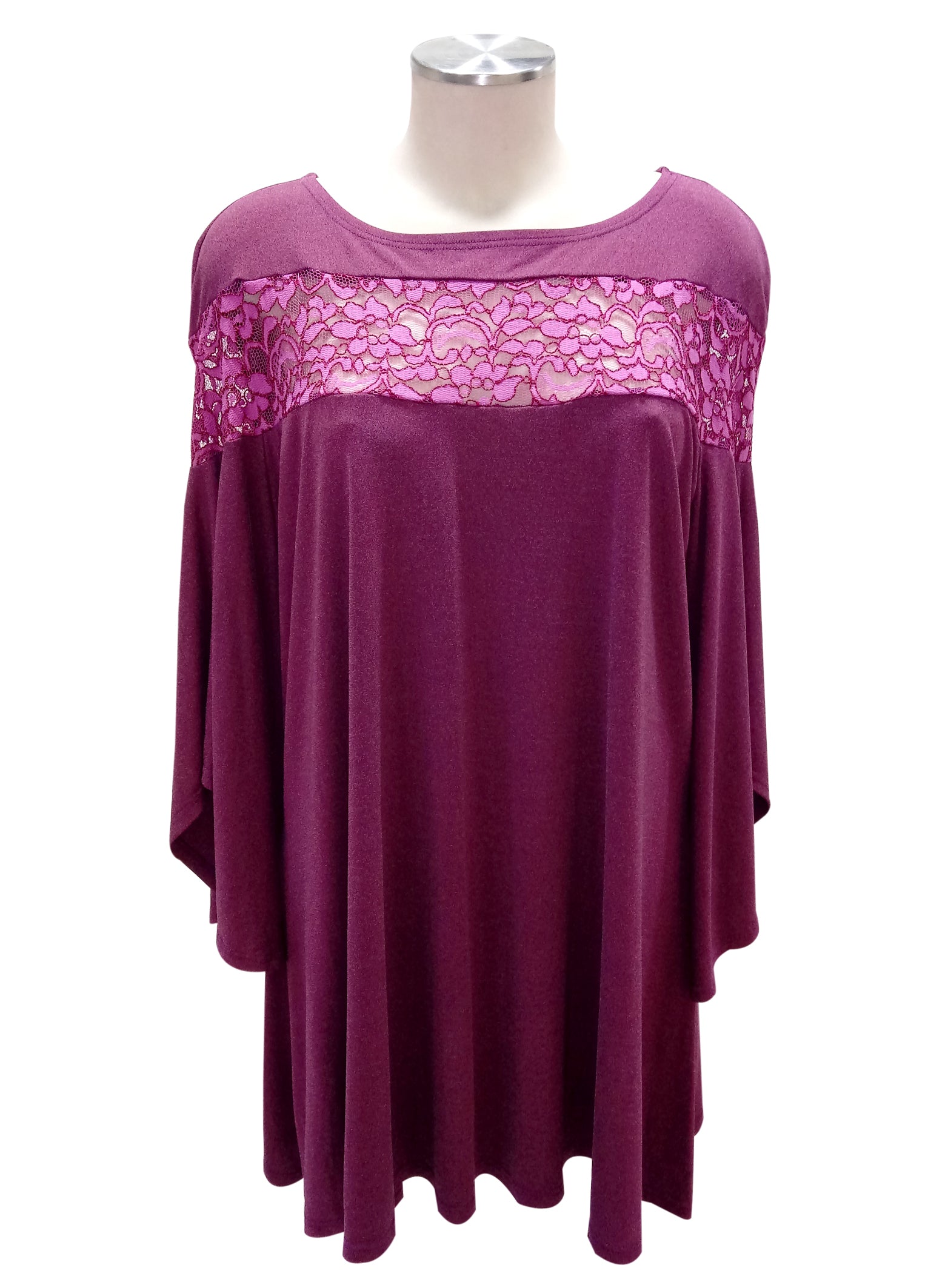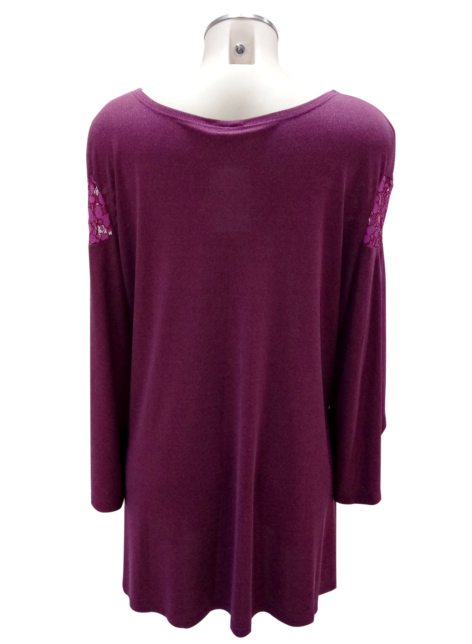 Maglia dallo stile casual con maniche a ¾; taglio a campana con un intarsio di merletto che crea un effetto vedo/non vedo nella parte sopra il seno.