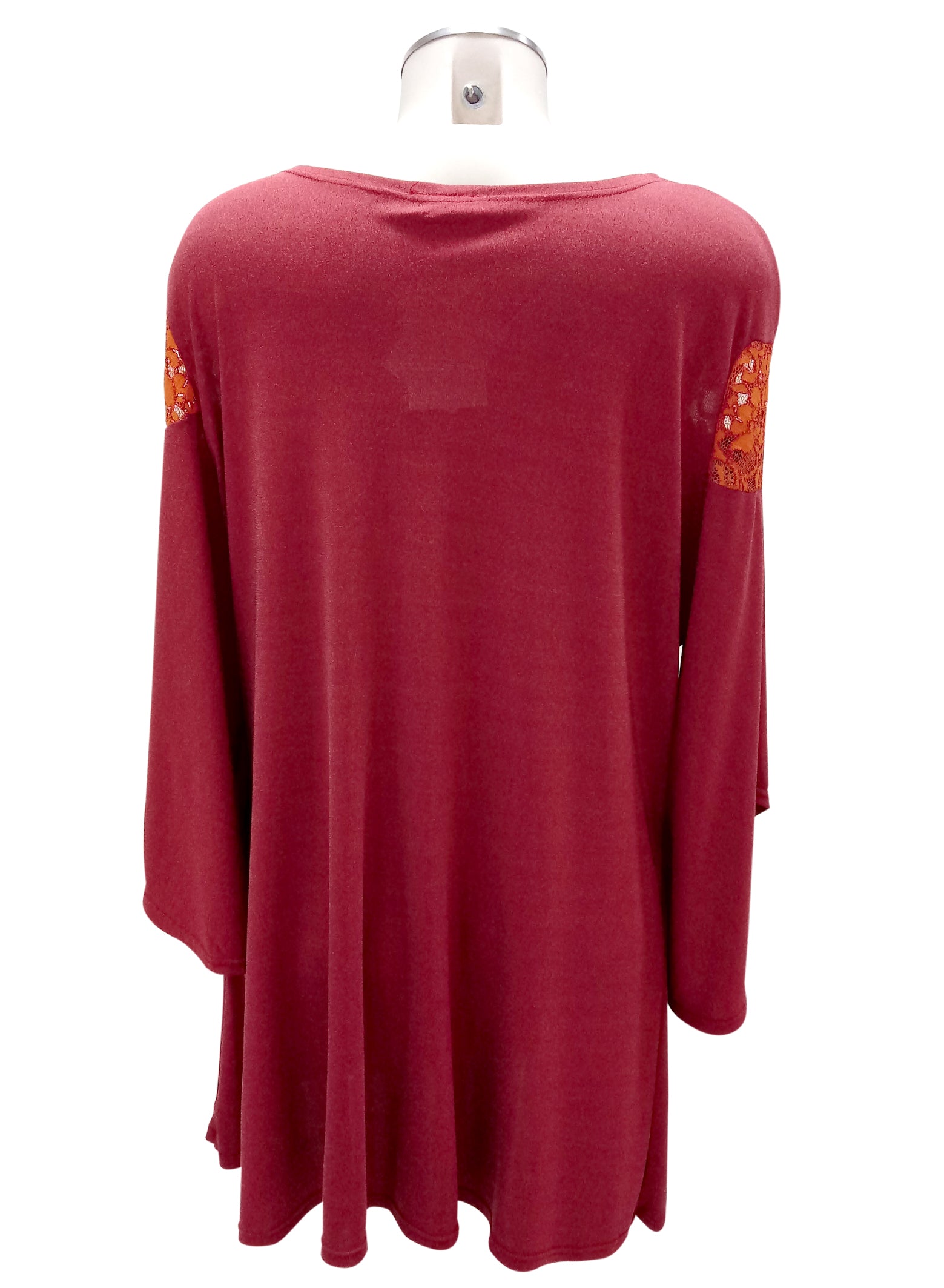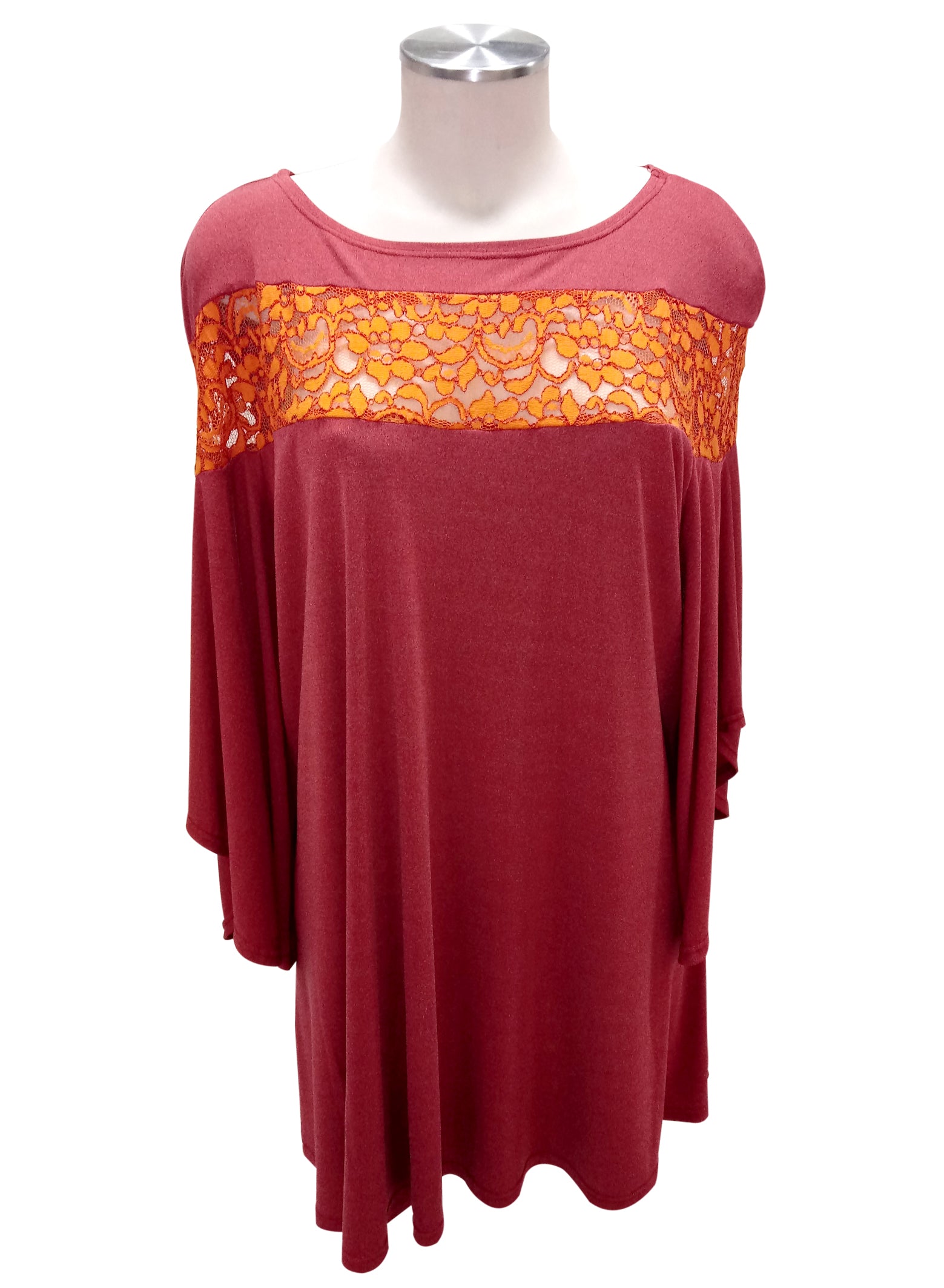 Maglia dallo stile casual con maniche a ¾; taglio a campana con un intarsio di merletto che crea un effetto vedo/non vedo nella parte sopra il seno.