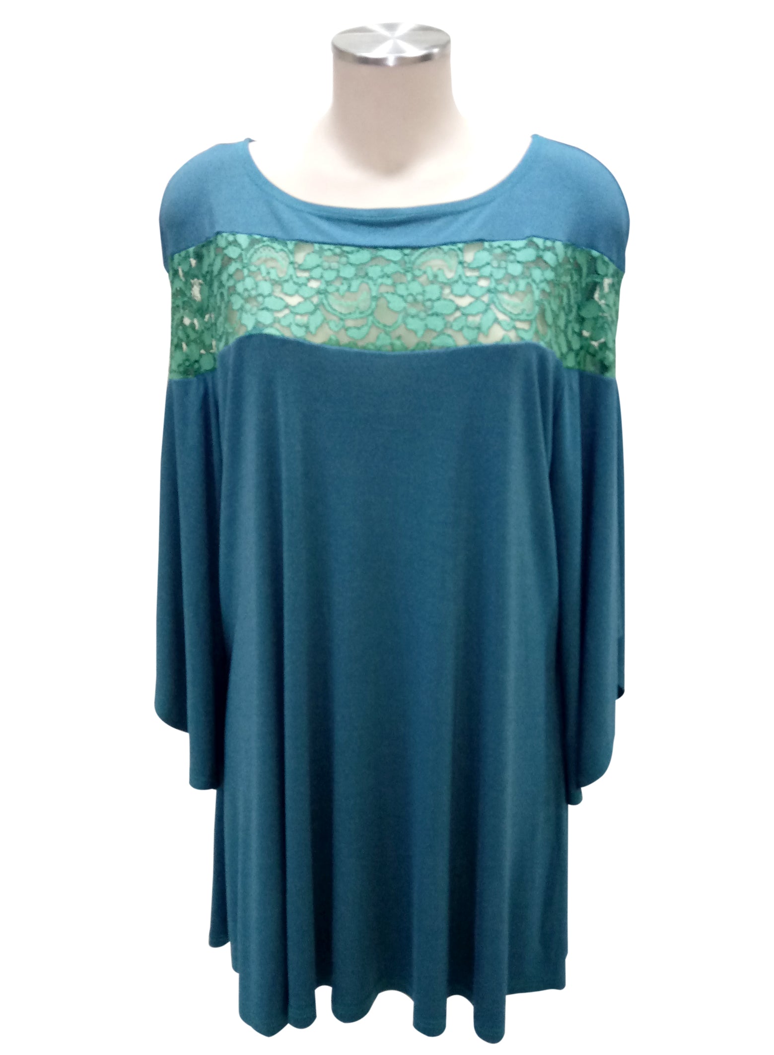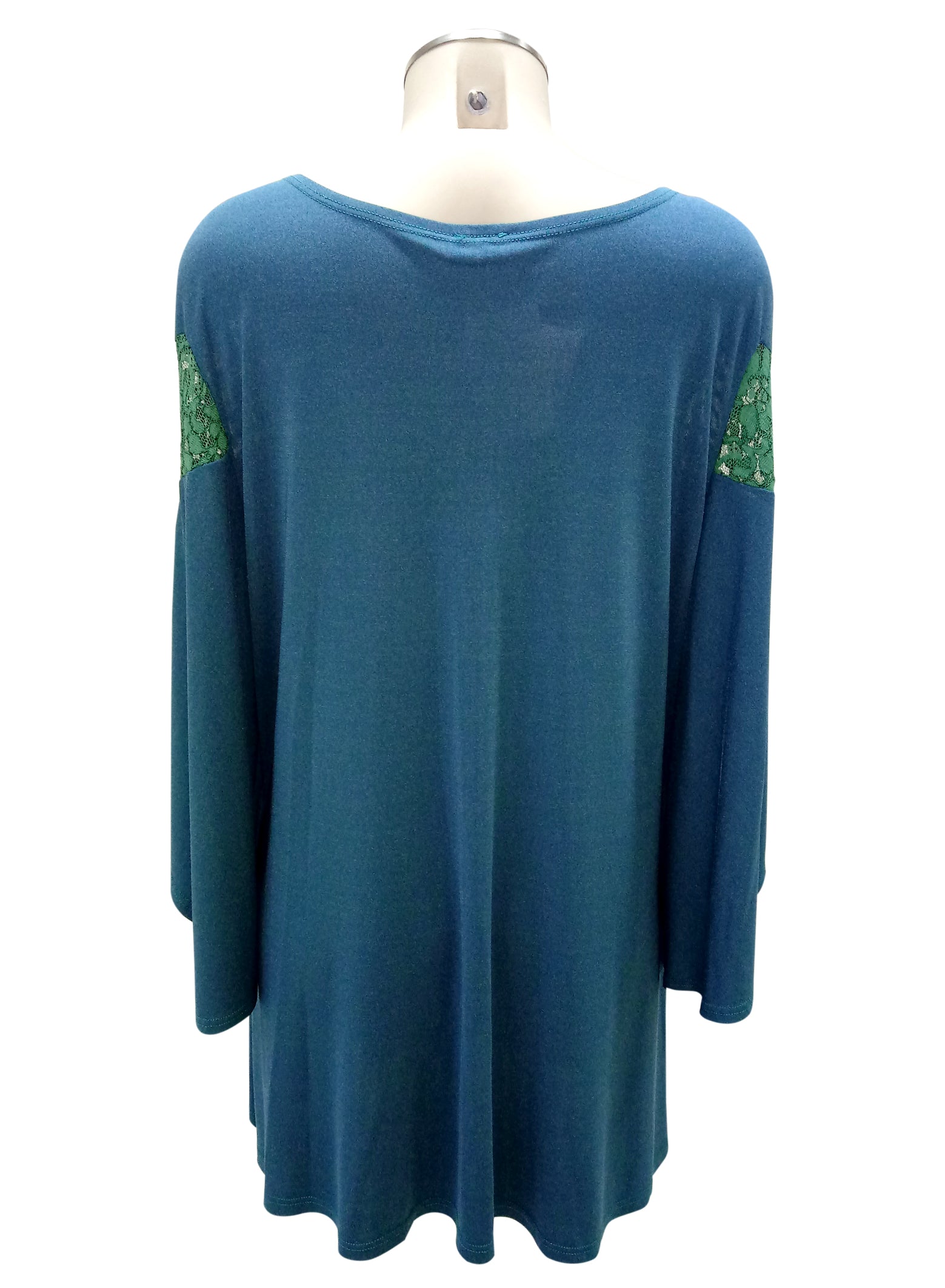 Maglia dallo stile casual con maniche a ¾; taglio a campana con un intarsio di merletto che crea un effetto vedo/non vedo nella parte sopra il seno.
