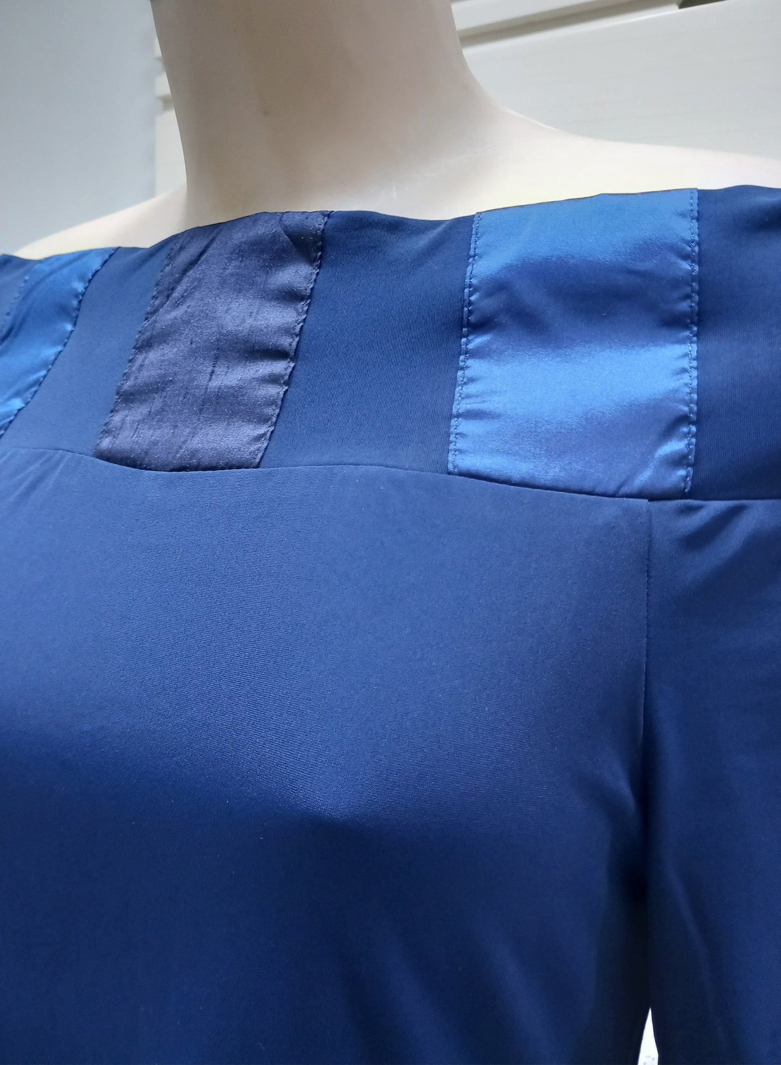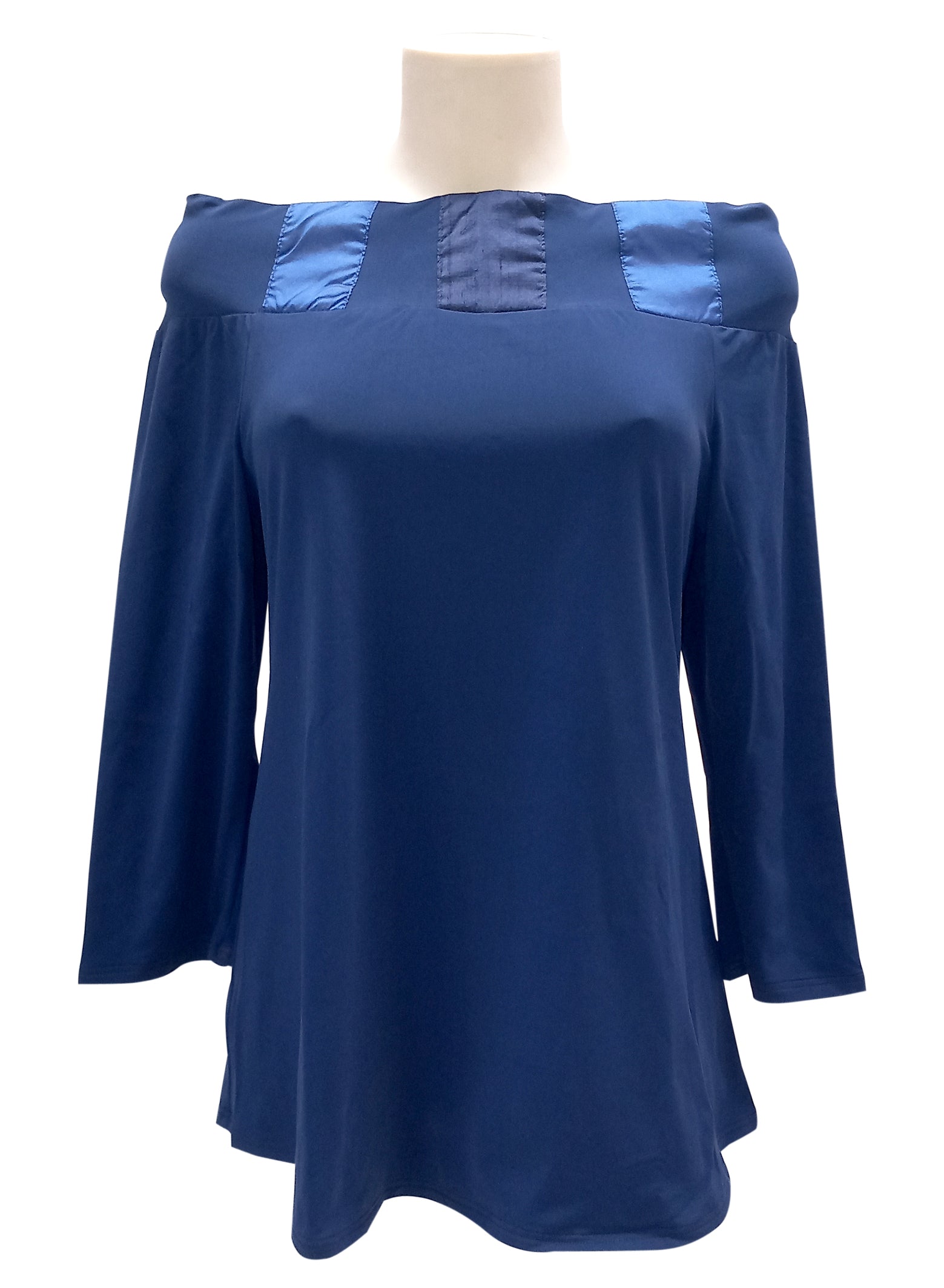 La maglia Ohara ha uno scollo a barca e può essere indossata anche scesa sulle spalle. Particolari di questa maglia sono il tessuto caldo ed elasticizzato con il quale è stata realizzata, e le applicazioni in tessuto di varie sfumature sul blu applicate sul collo.