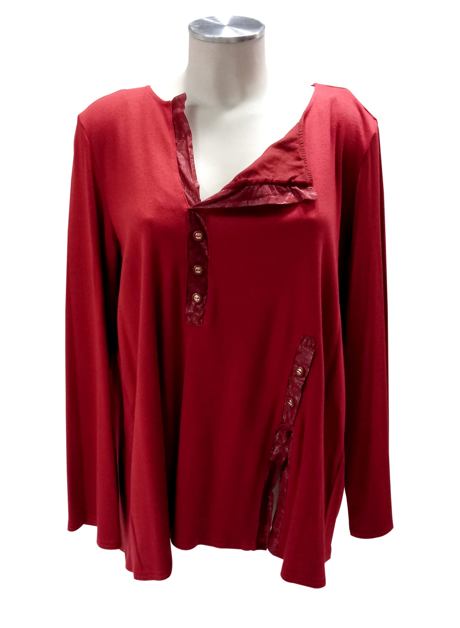 Maglia dall’ampia vestibilità, grazie alla piega a chiusa sul dietro. La scollatura, leggermente asimmetrica con i bottoni, ricorda una “polo”. Un tocco di originalità è dato dallo spacco presente sul davanti, sempre arricchito da bottoni. È realizzata in 100% cotone.