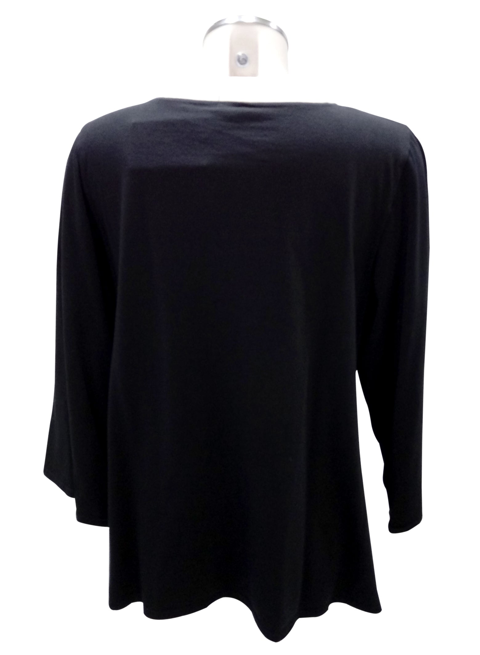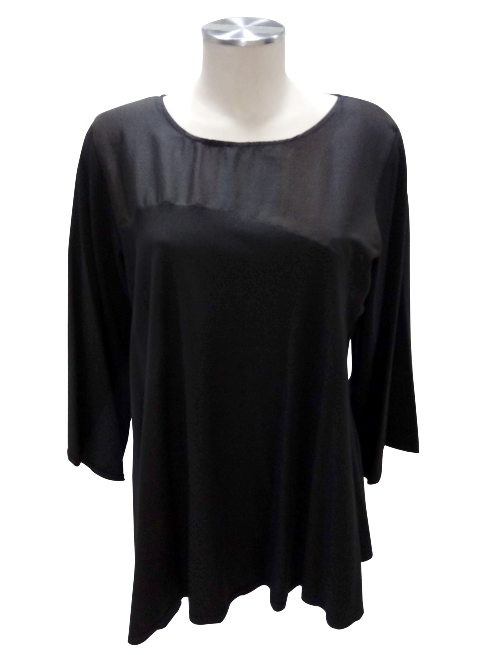 Maglia morbida realizzata in cotone 100%. Sulla scollatura davanti presenta un motivo asimmetrico con tessuto a fantasia, sui toni del colore principale della maglia.