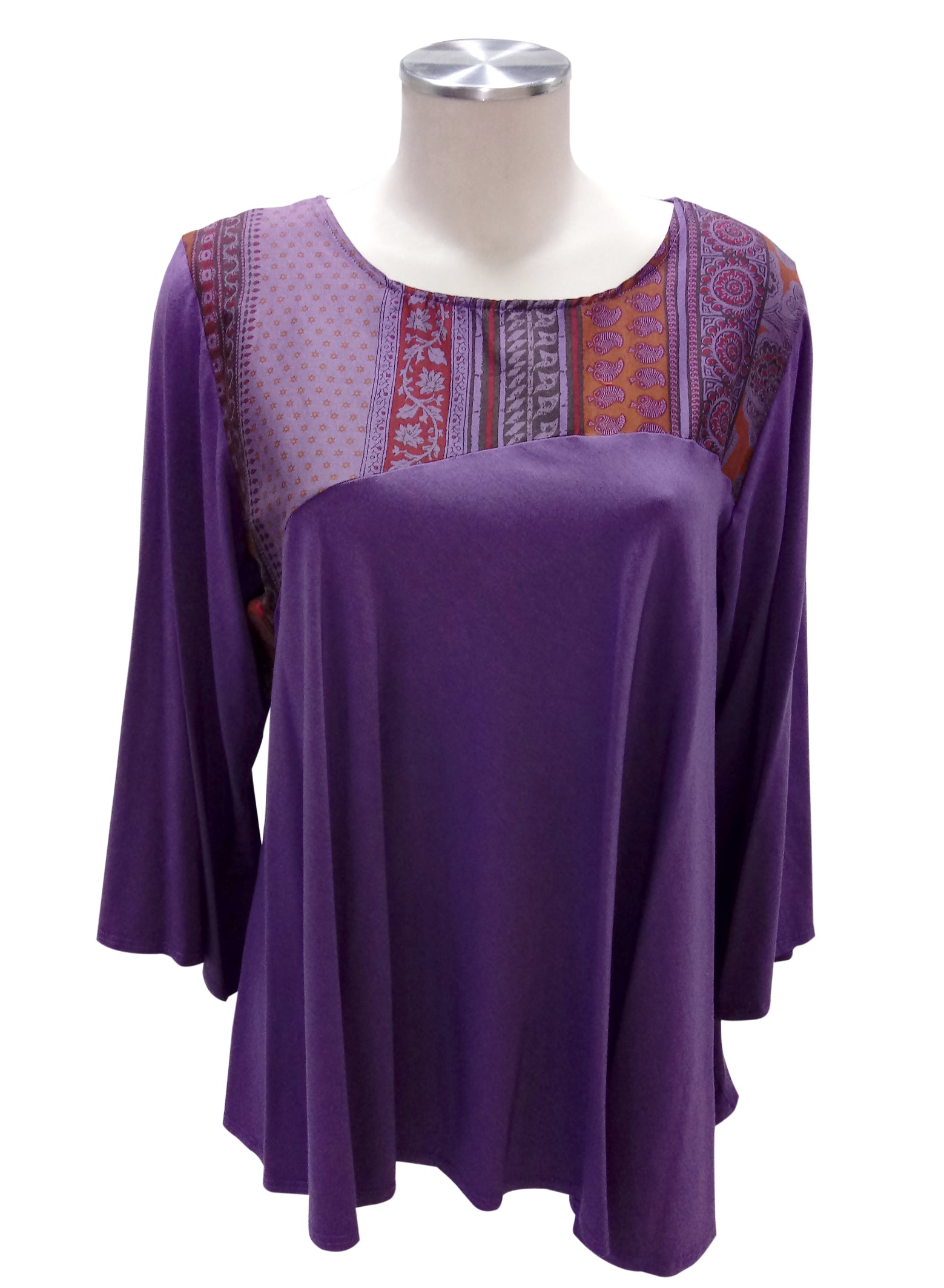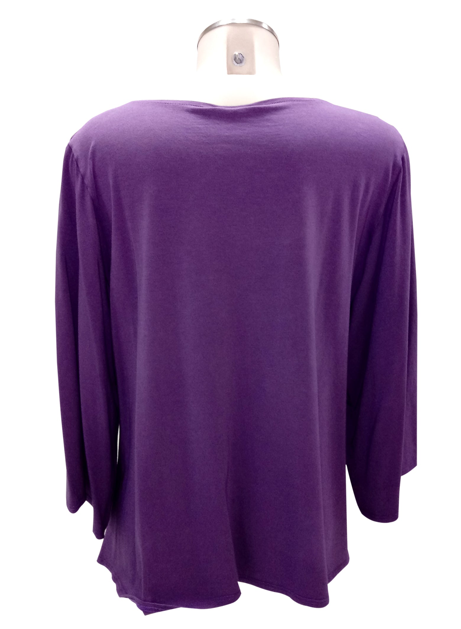 Maglia morbida realizzata in cotone 100%. Sulla scollatura davanti presenta un motivo asimmetrico con tessuto a fantasia, sui toni del colore principale della maglia.
