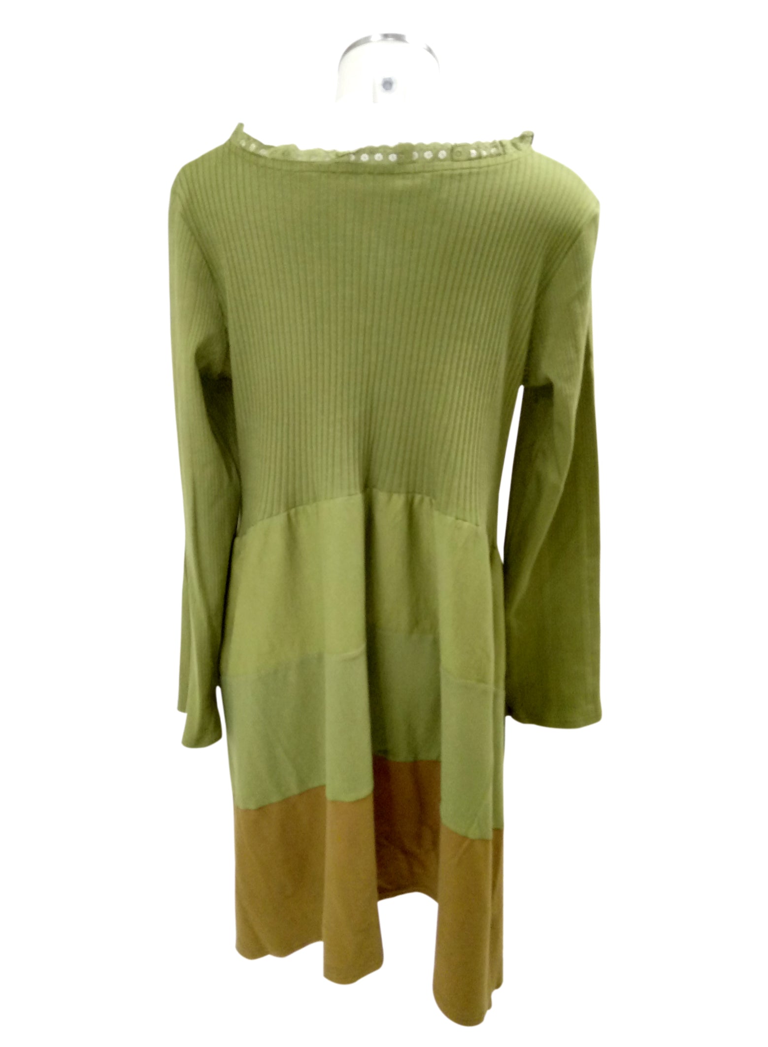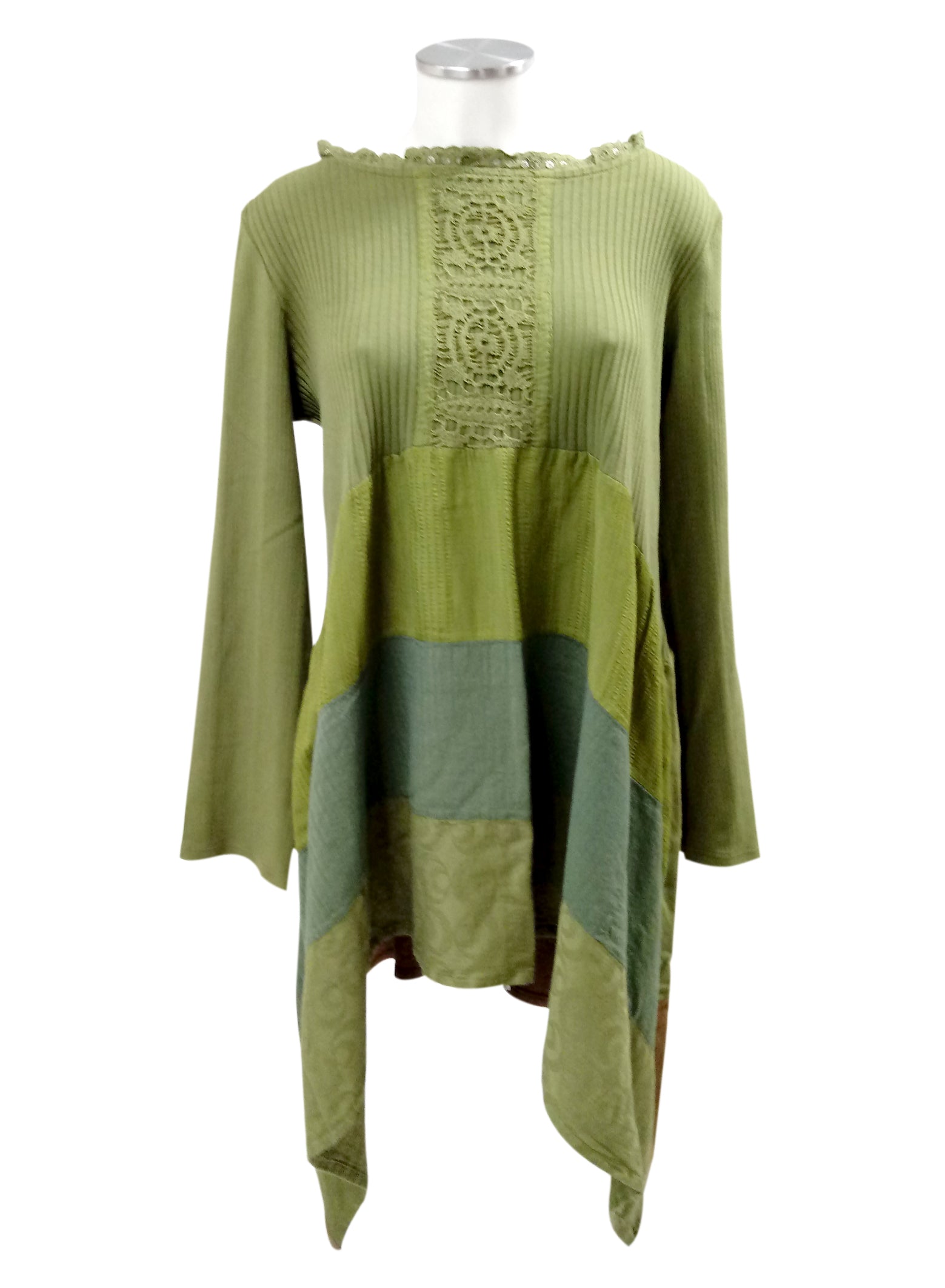 Maglia lunga o mini-abito dallo stile casual. Taglio impero e scollatura a barca impreziosita da pizzo sangallo in cotone. Ha una lunghezza asimmetrica sui fianchi ed è realizzato abbinando tessuto in maglia di cotone leggermente stretch, tono su tono.