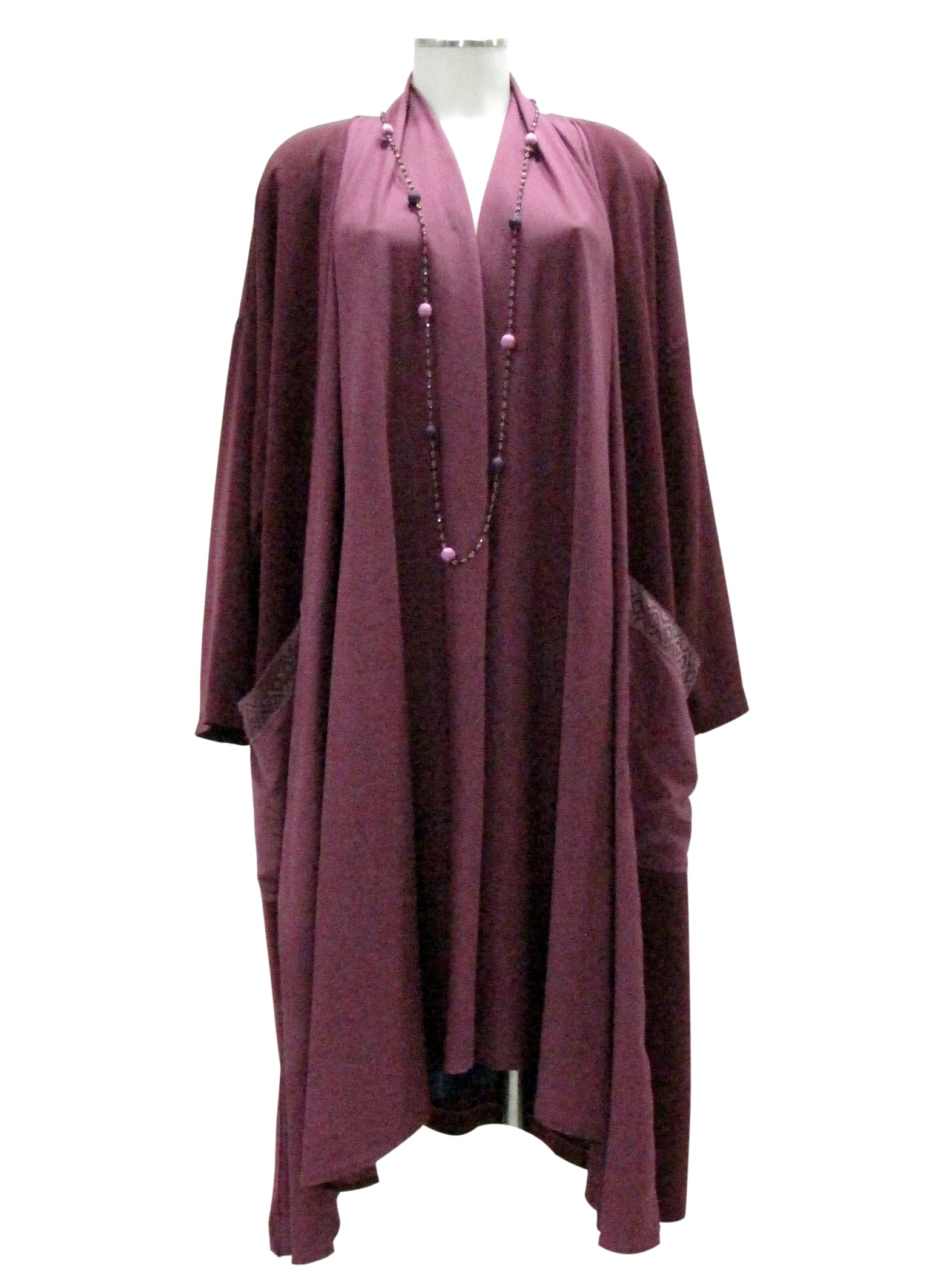 Elegante e morbido soprabito dallo stile inconfondibile Calamo. Realizzato in cady di viscosa, presenta due comode tasche sui fianchi e maniche a kimono. Il taglio dritto è impreziosito dal collo a sciarpa (foderato).