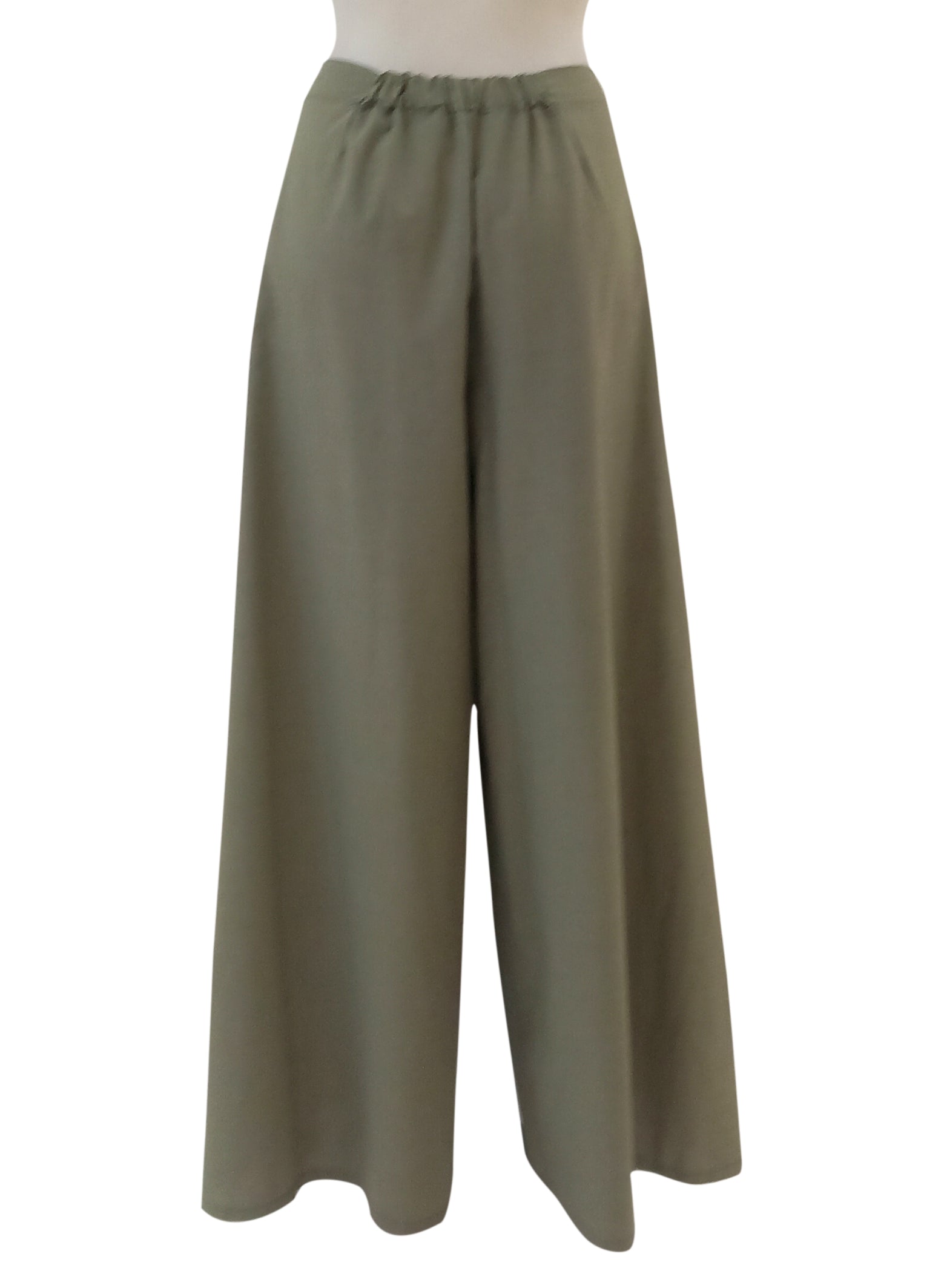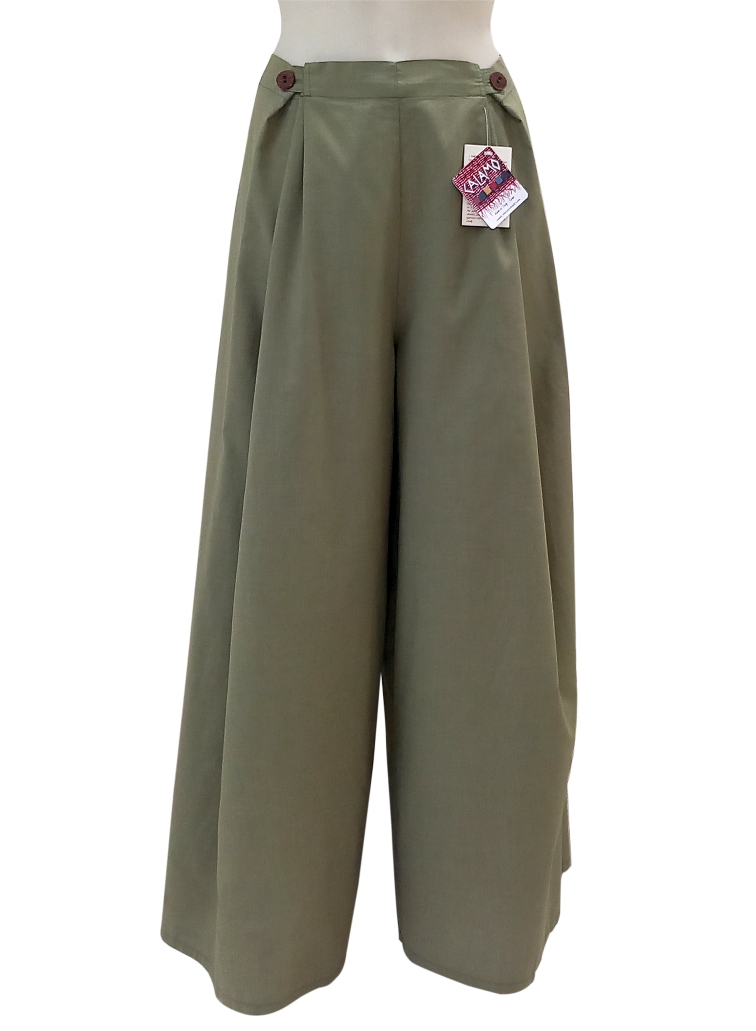 Pantalone morbido a palazzo, realizzato in cotone 100%. Consente un ampia vestibilità in quanto la misura della vita è regolabile: i bottoni possono essere spostati e regolati sul proprio punto vita.