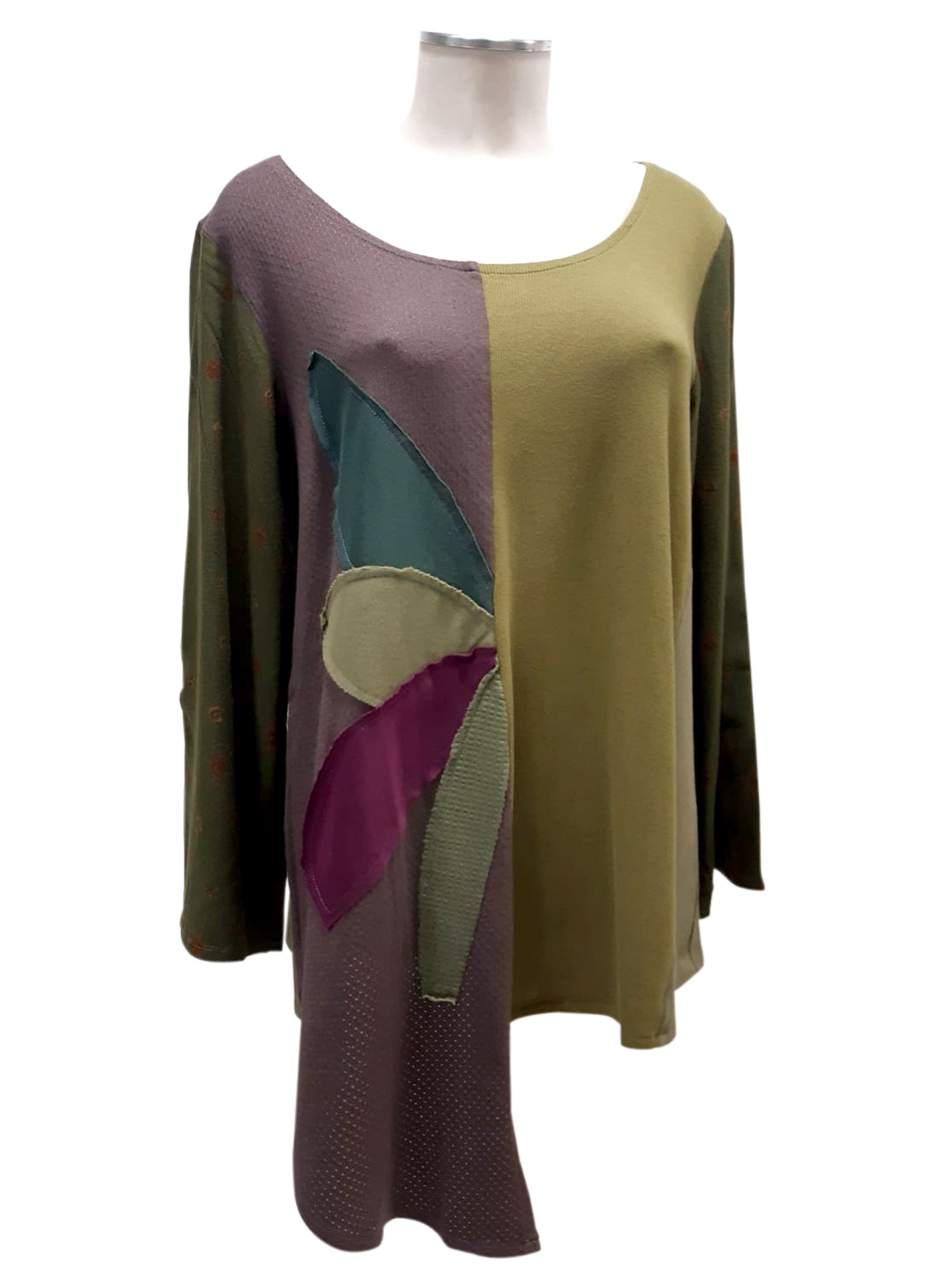 Maglia dallo stile casual, realizzata in cotone con motivi e inserti patchwork*, su stessa scala di colore. È asimmetrica sul davanti e ha delle ampie maniche a ¾.